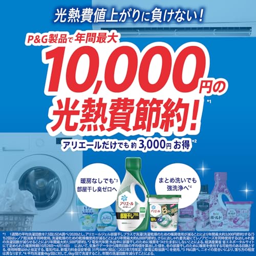 アリエール 洗濯洗剤 ジェルボール4D 詰め替え ハイパージャンボ 33個。 液体洗剤の約8倍の消臭成分配合 *1 ニオイゼロへ! 徹底抗菌 *2 漂白剤なしでも一発洗浄 *3 エリソデ汚れも徹底洗浄 イヤなニオイも消臭 洗濯槽のカビ防止:洗濯槽クリーナーなしでカビ対策OK すすぎ1回OK! *1 当社液体洗剤比 *2 全ての菌の増殖を抑えるわけではありません。 *3 P&G調べ。 汚れの度合いにより、汚れ落ちの程度は異なります。 アリエール 洗濯洗剤 ジェルボール4D 詰め替え。 液体洗剤の約8倍の消臭成分成分*(*当社液体洗剤比)。 エリそで汚れも徹底洗浄。 もちろん徹底抗菌* (*全ての菌の増殖を抑えるわけではありません。 )。 漂白剤なしでも一発洗浄*(*P&G調べ。 汚れ落ちの度合いにより、汚れ落ちの程度は異なります。 )。 洗濯槽クリーナーなしでも洗濯槽の防カビOK。 洗濯洗剤。 S000-K9999