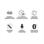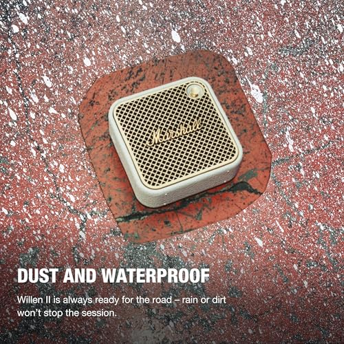 Marshall ワイヤレスポータブル防水スピーカー Willen II クリーム 連続再生17時間/IP67防水仕様/超小型/急速充電 【国内正規品】。 【マーシャル・シグネチャーサウンド】小型ながらもパワフルなマーシャル・シグネチャーサウンドを奏でます。 前モデルに比べ、低音や全体的な音響性能がさらに向上しています。 改良されたドライバーにより、どの周波数も均等に響き、どの音量でもバランスの取れたサウンドを楽しむことができます。 Willen IIは、そのサイズを超えた実力を発揮します。 【最大約17時間連続再生】1回の充電で最大約17時間の音楽再生が可能です。 そのコンパクトなサイズ、耐久性、そして信頼できる再生時間により、外出時の必携アイテムとなります。 バッテリーが切れた場合でも、わずか2.5時間でフル充電が完了します。 急速充電に対応しており、20分の充電で5.5時間の再生時間を確保できるため、すぐにリスニングセッションを再開できます。 【防塵防水仕様】非常に耐久性が高く、使いやすいデザインを誇ります。 アイコニックなマーシャルデザインと頑丈さを兼ね備えたWillen IIは、水に濡れることを気にせず、タフに使用できます。 IP67の防塵・防水性能を持ち、1メートル(約3フィート)の水中に最大30分間沈めても問題ありません。 【固定用ストラップ】立てて置く、寝かせる、物に固定する、またはゴム製の付属ストラップを使って吊るすなど、さまざまな使い方が可能な究極の多目的スピーカー、Willen IIをどこにでも持ち運んで、好きなトラックを誰とでもシェアすることができます。 【内蔵マイク】内蔵マイクが搭載されているので、完全にハンズフリーで通話が可能です。 スピーカーを好きな場所に置いて、会話を楽しめます。 朝の支度中でも、夜の外出前でも、あなたの準備を邪魔しません。 S000-K9999