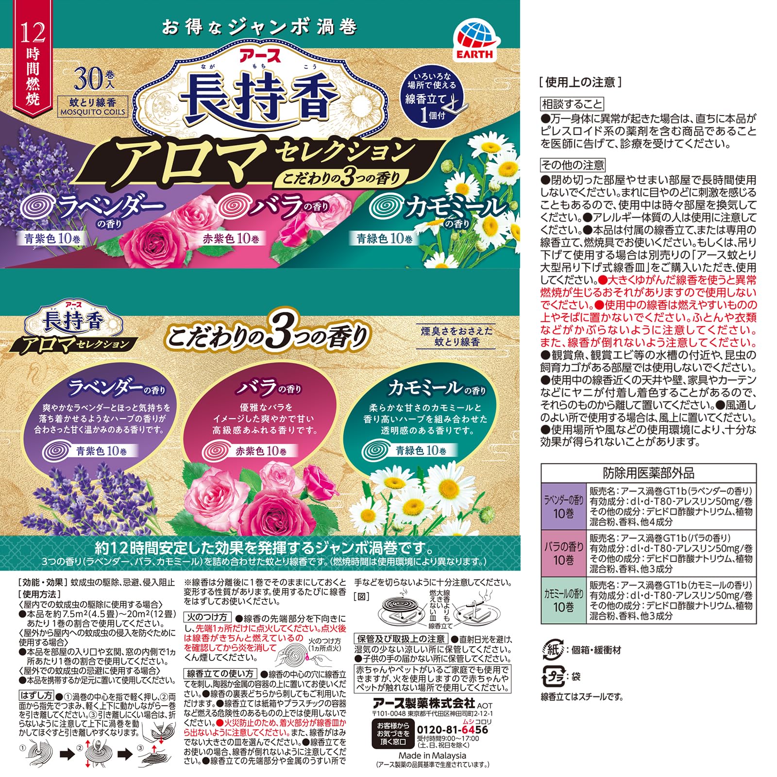 アース長持香 蚊とり線香 アロマ セレクション 30巻 線香立て付き 長時間 屋内 屋外 蚊よけ 蚊とり 駆除 対策。 商品紹介 お得なジャンボ渦巻「長時間タイプ」 蚊成虫に対して駆除・忌避・侵入阻止の3つの効果を発揮します。 約12時間安定した効果を発揮するジャンボ渦巻です。 (燃焼時間は使用環境により異なります。 ) 3つの香り(ラベンダー、バラ、カモミール)を詰め合わせた蚊とり線香です。 いろいろな場所で使える線香立て1個付 【こだわりの3つの香り】煙臭さをおさえた蚊とり線香 ・ラベンダーの香り(青紫色10巻) 爽やかなラベンダーとほっと気持ちを落ち着かせるようなハーブの香りが合わさった甘く温かみのある香りです。 ・バラの香り(赤紫色10巻) 優雅なバラをイメージした爽やかで甘い高級感あふれる香りです。 ・カモミールの香り(青緑色10巻) 柔らかな甘さのカモミールと香り高いハーブを組み合わせた透明感のある香りです。 【販売名】アース渦巻GT1b 【効能・効果】蚊成虫の駆除、忌避、侵入阻止 【防除用医薬部外品】 原材料・成分 【有効成分】dl・d-T80-アレスリン50mg/巻【その他の成分】・ラベンダーの香り:デヒドロ酢酸ナトリウム、植物混合粉、香料、他4成分・バラの香り:デヒドロ酢酸ナトリウム、植物混合粉、香料、他3成分・カモミールの香り:デヒドロ酢酸ナトリウム、植物混合粉、香料、他3成分 使用方法 【屋内での蚊成虫の駆除に使用する場合】 本品を約7.5平方メートル(4.5畳)から20平方メートル(12畳)あたり1巻の割合で使用してください。 【屋外から屋内への蚊成虫の侵入を防ぐために使用する場合】 本品を部屋の入り口や玄関、窓の内側で1ヵ所あたり1巻の割合で使用してください。 【屋外での蚊成虫の忌避に使用する場合】 本品を携帯するか足元に置いて使用してください。 【はずし方】 (1)渦巻の中心を指で軽く押し、(2)両面から指先でつまみ、軽く上下に動かしながら一巻を引き離してください。 (3)引き離しにくい場合は、折らないように注意して上下に渦巻を動かしてほぐすと引き離しやすくなります。 ※線香は分離後に1巻でそのままにしておくと変形する性質があります。 使用するたびに線香をはずしてお使いください。 【火のつけ方】 線香の先端部分を下向きにし、先端1ヵ所だけに点火してください。 点火後は線香がきちんと燃えているのを確認してから炎を消してくん煙してください。 【線香立ての使い方】 線香の中心の穴に線香立てを刺し、陶器か金属の容器の上に置いてお使いください。 線香の裏表どちらから刺してもご利用いただけます。 線香立ては紙箱やプラスチックの容器など燃える危険性のあるものの上では使用しないでください。 火災防止のため、着火部分が線香皿から出ないように注意してください。 また、線香がはみでない大きさの皿を選んでください。 線香立てをお使いの場合、線香が倒れないように注意してください。 線香立ての先端部分や金属のうすい所で手などを切らないように十分注意してください。 安全警告 【相談すること】 万一身体に異常が起きた場合は、直ちに本品がピレスロイド系の薬剤を含む商品であることを医師に告げて、診療を受けてください。 【その他の注意】 閉め切った部屋やせまい部屋で長時間使用しないでください。 まれに目やのどに刺激を感じることもあるので、使用中は時々部屋を換気してください。 アレルギー体質の人は使用に注意してください。 本品は付属の線香立て、または専用の線香立て、燃焼具でお使いください。 もしくは、吊り下げて使用する場合は別売りの「アース蚊とり大型吊り下げ式線香皿」をご購入いただき、使用してください。 大きくゆがんだ線香を使うと異常燃焼が生じるおそれがありますので使用しないでください。 使用中の線香は燃えやすいものの上やそばに置かないでください。 ふとんや衣類などがかぶらないように注意してください。 また、線香が倒れないよう注意してください。 観賞魚、観賞エビ等の水槽の付近や、昆虫の飼育カゴがある部屋では使用しないでください。 使用中の線香近くの天井や壁、家具やカーテンなどにヤニが付着し着色することがあるので、それらのものから離して置いてください。 風通しのよい所で使用する場合は、風上に置いてください。 使用場所や風などの使用環境により、十分な効果が得られないことがあります。 約12時間、安定した効果を長時間発揮する3つの香り付きジャンボ渦巻香 ※燃焼時間は使用環境により異なります。 駆除・忌避・侵入阻止の3つの効果を蚊成虫に対して発揮。 いろいろな場所で使える線香立て1個付。 【こだわりの3つの香り】バラ・カモミール・ラベンダー。 【効能・効果】蚊成虫の駆除、忌避、侵入阻止。 S000-K9999