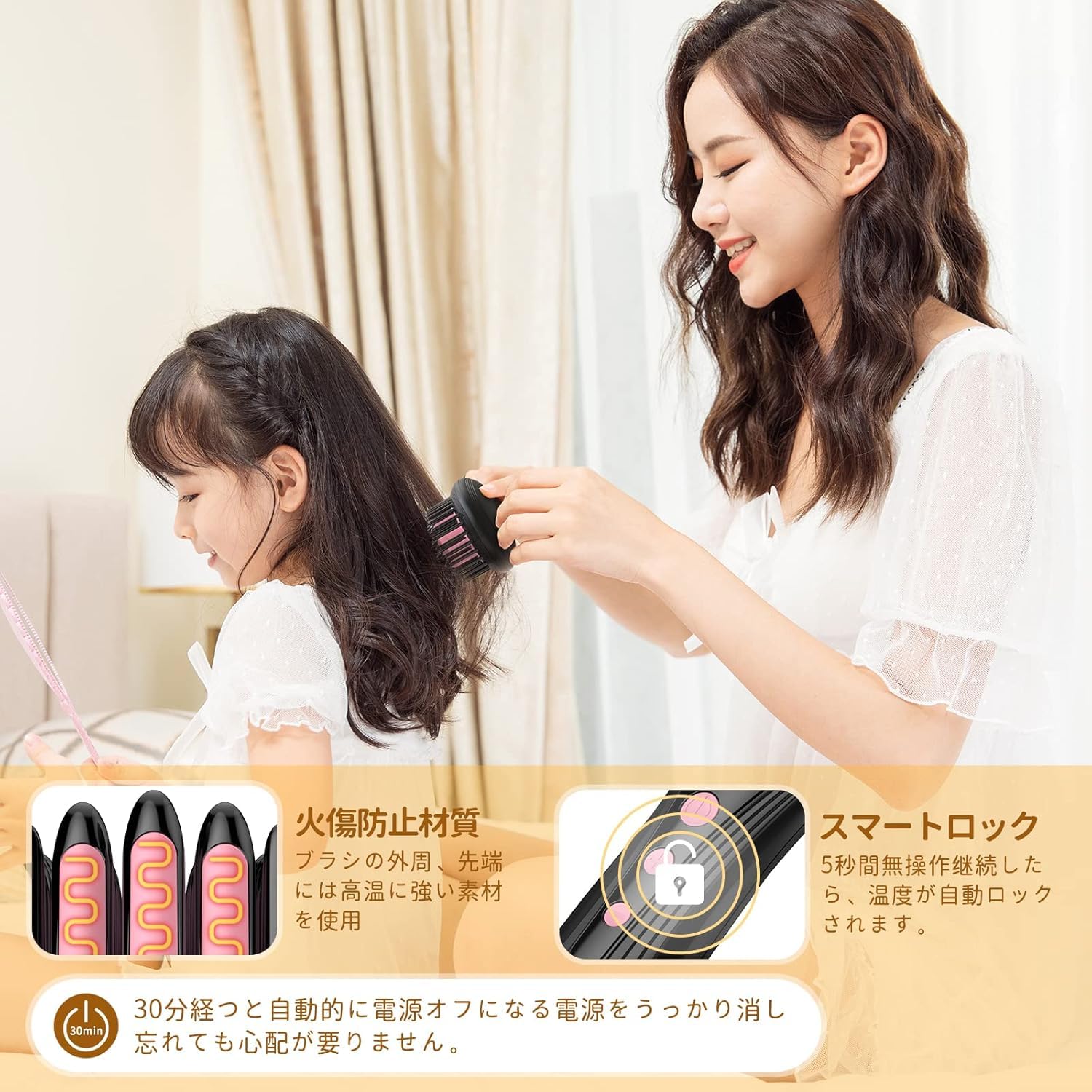 POLENTAT ストレートブラシ ブラシ型ヘアアイロン ヒートブラシ マイナスイオン搭載 サロン級 MAX220℃ デジタル温度表示 6段階温度調整 温度記憶 急速加熱 静電気防止 火傷防止 自動電源オフ 時短スタイリング 海外対応 収納袋付き プレゼントにおすすめ。 【マイナスイオンで髪にツヤと潤いを】POLENTATストレートブラシは、億単位のマイナスイオンを発生するイオナイザーを搭載。 寝ぐせ・広がり・うねりを整えながら、静電気などのプラスイオンを中和し、キューティクルを保護します。 髪に潤いと自然なツヤを与え、サロン帰りのような質感を毎日実感できます。 さらに、ヒートピンにはセラミックコーティングを施し、摩擦を軽減しながらなめらかな通り心地を実現。 高密度配置でも絡みにくく、毛先までしっかりキャッチ。 髪をやさしく整えるので、ダメージが気になる方や敏感な髪質の方にも安心してご使用いただけます。 毎日のスタイリングに使える安心設計で、忙しい朝もスムーズに美しい仕上がりに。 【サラツヤ髪へ導く・安心の火傷防止設計】 高濃度マイナスイオン発生器を搭載し、スタイリング時の静電気を効果的に抑制。 乾燥しがちな冬でも髪に潤いとツヤを与え、パサつきを抑えて、指通りなめらかなサラツヤ髪に仕上がります。 さらに、ヒートブラシの先端部分は耐熱素材でしっかり保護されており、ブラシが直接肌に触れにくい設計。 従来の挟み込むヘアアイロンと異なり、火傷のリスクを大幅に軽減。 初心者の方でも安心してお使いいただけます。 また、最大220℃のプロ仕様高温設定で、髪質やスタイリング目的に応じて幅広く対応。 くせ毛を伸ばしたい方も、軽くボリュームを出したい方もこれ1本でOK。 日常のケアからお出かけ前の仕上げまで、これ一本で美しいスタイルをサポートします。 【6段階温度調節&髪にやさしいクシ通り】120℃~220℃までの20℃刻み6段階温度調節が可能で、細くて柔らかい髪やダメージ毛、太くて硬い髪など、あらゆる髪質にぴったりの温度を簡単に設定できます。 シンプルで使いやすい操作ボタンは、+/-ボタンで直感的に温度調整が可能。 さらに、誤操作を防ぐためにボタンは凹型デザインとなっており、スタイリング中にうっかり触れてしまう心配もありません。 また、ブラシの櫛歯は滑らかな楕円形設計。 髪に引っかかりにくく、スムーズなブラッシングで摩擦や引っ張りによるダメージを軽減。 髪へのやさしさを考え抜いた設計で、毎日のスタイリングがもっと快適になります。 【急速加熱&時短スタイリング】 わずか60秒で120℃に到達する高速ヒートアップを実現。 一般的なブラシアイロン(約90〜120秒)に比べて約30〜50%の時短を実現し、朝の貴重な時間を有効に活用できます。 さらに、デジタル温度表示を搭載しているため、温度の上昇具合や現在の設定温度がひと目で確認でき、スタイリングのタイミングも逃しません。 広いブラシ面&高密度の櫛歯設計により、熱がムラなく髪全体に伝わり、ブラッシングするだけでナチュラルなストレートヘアに仕上がります。 髪への負担も少なく、初心者でも使いやすい設計で、毎朝のスタイリングがもっとスムーズに。 また、旅行先や外出先でも素早く整えられるので、急な予定やお出かけ前の仕上げにもぴったり。 忙しい毎日でも、時短×キレイを叶える頼れるアイテムです。 【メモリー機能搭載&省エネ設計】 従来の有線タイプでは、使用後に毎回プラグを抜く必要があり、不便に感じる方も多くいました。 本製品は、電源ボタンを長押しするだけで簡単に電源オフできる設計を採用。 プラグを抜く手間が省け、日々の使い勝手が向上しました。 また、電源オフ後は液晶画面も完全に消灯し、待機中の不要な電力消費を防止。 従来品のように画面が点灯・点滅し続けることもありません。 さらに、前回使用した温度を自動記憶するメモリー機能も搭載しているため、毎回温度を再設定する必要がなく、時短&省エネを同時に実現します。 さらに、便利な温度メモリー機能も搭載しています。 プラグを抜かずに使用すれば、一度設定した温度が記憶され、次回電源を入れた際には前回の設定温度で起動します。 これにより、毎回温度を調整する手間が省け、時間を大幅に節約できるだけでなく、製品寿命の延長にもつながります。 【安全設計&海外対応でどこでも安心】万が一電源を切り忘れても安心な自動電源オフ機能(約30分)を搭載。 外出前の慌ただしい時間でも、火傷や火災のリスクを軽減します。 さらに、電源コードは360°回転式で、どの角度でも自由に使え、ねじれや絡まりの心配がありません。 本製品は電気用品安全法(PSE)基準に適合しており、安全性にもこだわった設計。 また、100V~240Vの海外対応電圧で、国内はもちろん海外旅行や出張先でもそのまま使用可能です。 ※国や地域によって変換プラグが必要な場合がありますので、事前にご確認ください。 S000-K9999