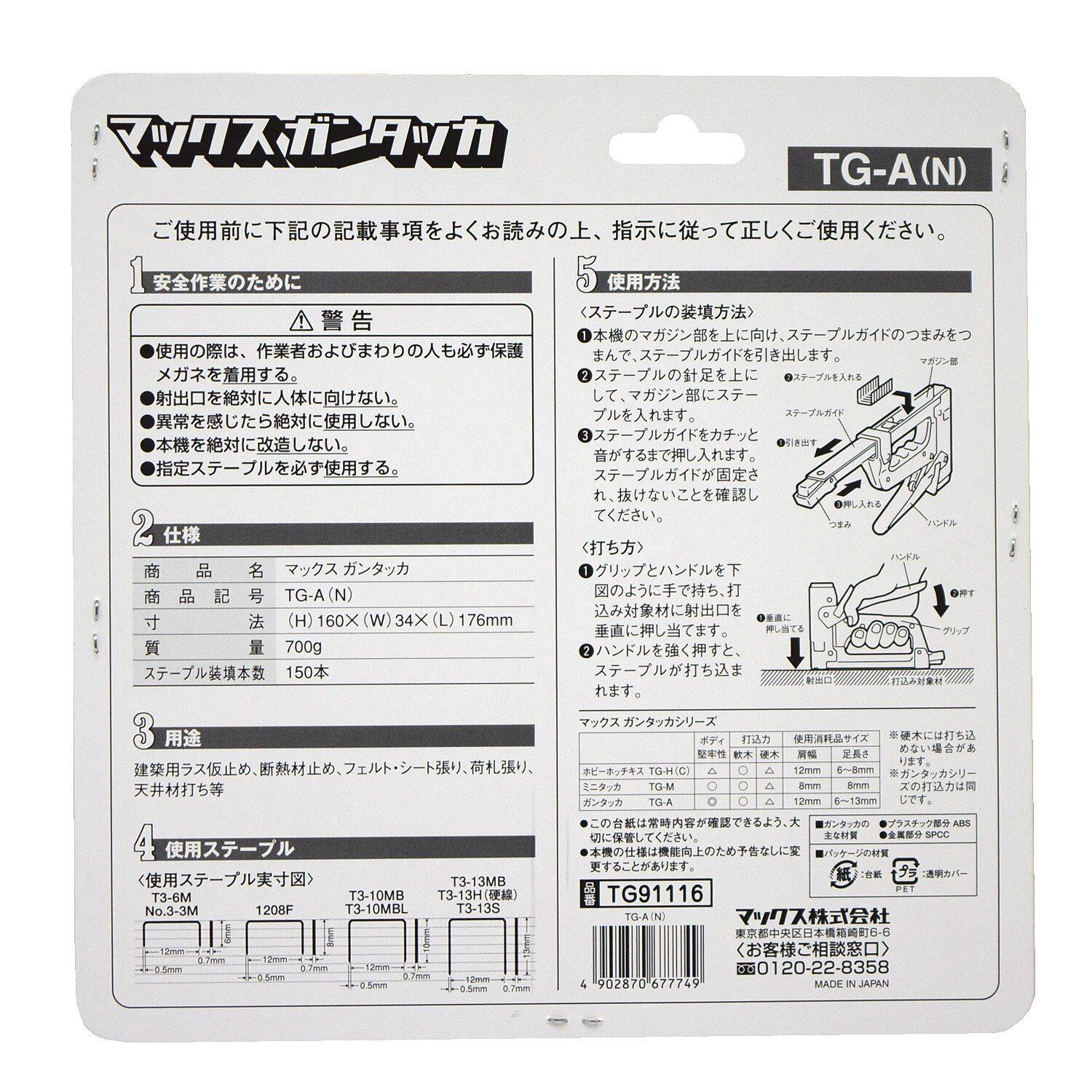 マックス(MAX) ガンタッカ TG-A(N)。 商品紹介 ガンタッカです。 質量(g):700 寸法(mm):H160×W34×L176 ステープル装填数(本):150 ステープル足長さ(mm):6/8/10/13 ボディカラー:茶(従来色) 個装:ブリスタパック オプション:T3ステープル ラス張り、防水シート張り。 商品はミニタッカ茶色です。 プロ仕様のガンタッカ イスの張替え、フェルト・シート貼り、荷札貼り、建築用ラス仮止め、断熱材止め、天井材打ち等の一般からプロまで使える商品。 重量(約):700g、カラー:ブラウン。 原産国:日本。 サイズ(約):幅17.6×奥3.4×高16cm。 種類: 単品。 S000-K9999