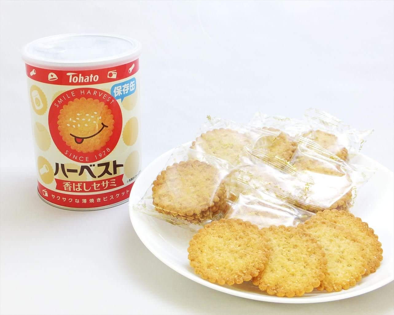 【2個セット】東ハト ハーベスト保存缶 (8包入) 香ばしセサミ。 ・遠赤焙煎製法で煎った焙煎ゴマと アクセントに発酵バターを加えて焼きあげた、ハーベスト香ばしセサミの長期保存用缶タイプです。 風味豊かなゴマの味わいがお楽しみ頂けます。 ・缶を開けた後も、フタつきで再度閉められるので衛生的。 ※直射日光・高温多湿を避けて冷暗所に保存してください。 S350-K9999
