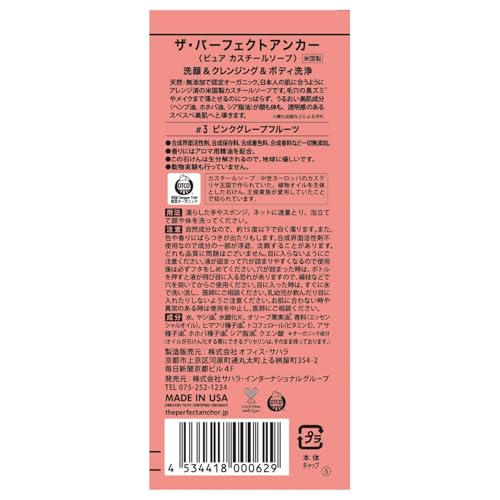 ザ・パーフェクトアンカー ピュアカスチールソープ ピンクグレープフルーツ 236ml。 商品紹介 天然・無添加で認定オーガニック。 日本人の肌に合うようにアレンジ済の米国製カスチールソープです。 毛穴の黒ズミ(※1)やメイクまで落とせるのにつっぱらず、うるおい美肌成分(ヘンプ油、ホホバ油、シア脂油)が顔も体も、透明感のあるスベスベ美肌へと導きます。 ※1…酸化皮脂などによる汚れ 使用方法 濡らした手やスポンジ、ネットに適量とり、泡立てて顔や体を洗ってください。 安全警告 自然成分なので、約15度以下で白く濁ります。 また、色や香りにばらつきが出たりもします。 合成界面活性剤不使用なので成分の一部が浮遊、沈殿することがあります。 どれも品質に問題はございません。 目に入らないようにご注意ください。 液が固まって穴が詰まりやすくなるので使用後は必ずフタをしめてください。 穴が詰まった時は、ボトルを押すと液が飛び目に入る恐れがありますので、楊枝などで穴を突いてからご使用ください。 目に入った時は、すぐに水で洗い流し、医師にご相談ください。 乳幼児が飲んだり目に入れたりしないようご注意ください。 お肌に合わない時や異常のある時は使用を中止し、医師にご相談ください。 100%天然で認定オーガニック。 潤い美肌成分が顔も体も透明感あるスベスベ美肌に。 S000-K9999