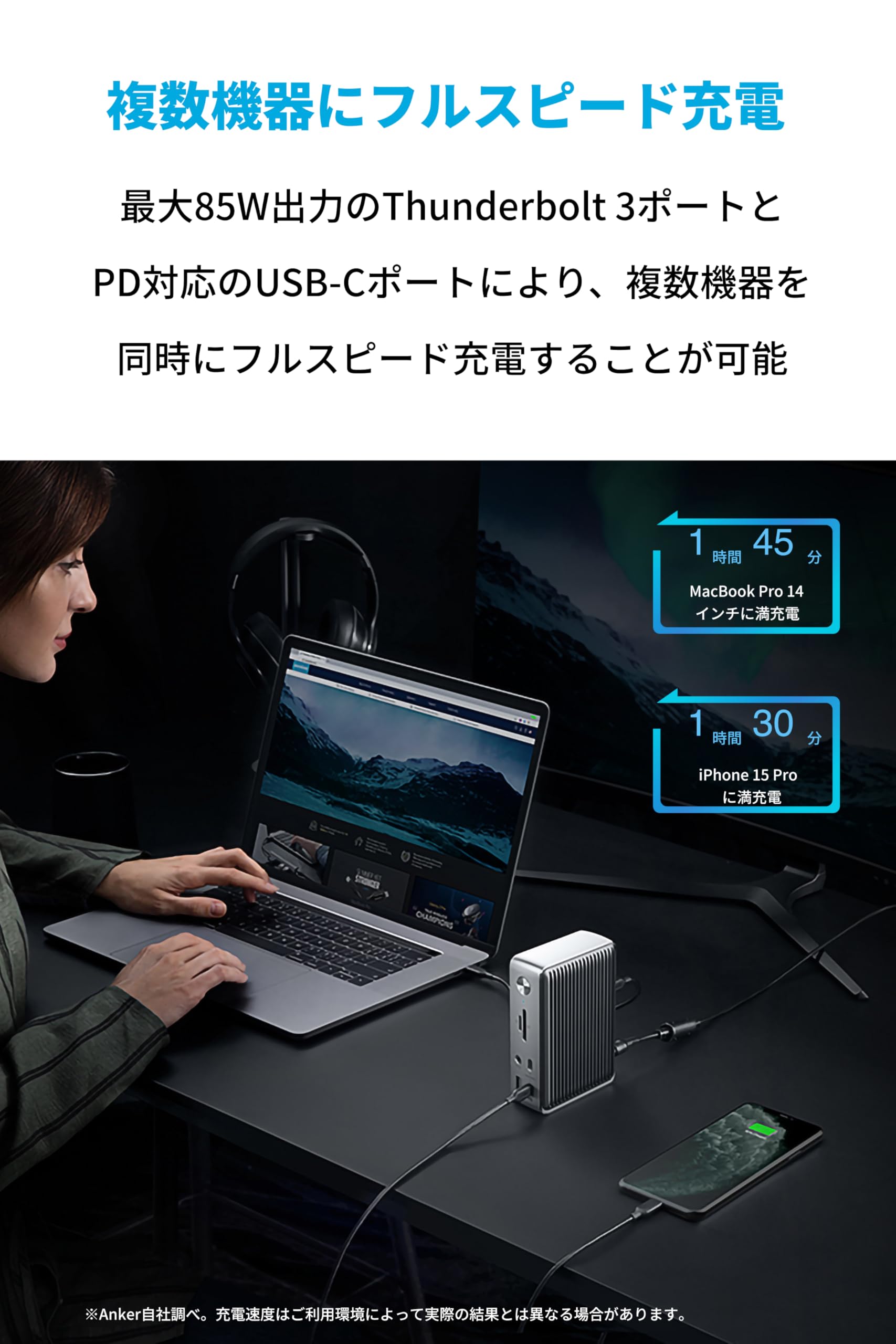 Anker PowerExpand Elite 13-in-1 Thunderbolt 3 Dock ドッキングステーション 85W出力 USB Power Delivery 対応 USB-Cデータ & 充電ポート USB-A 4K対応 HDMI 1Gbps イーサネット 3.5mmオーディオジャック microSD&SDカード スロット搭載。 Ankerの強み:3000万人以上が支持するAmazon第1位の充電製品ブランドを是非お試しください。 13のポートをひとつに:2つのThunderbolt 3 USB-Cポート、2つのUSB-Cポート、4つのUSB-Aポート、HDMIポート、イーサネットポート、microSD&SDカードスロット、3.5mmオーディオジャックに接続が可能です。 複数機器にフルスピード充電:最大85Wと最大15W出力に対応した2つのThunderbolt 3 USB-Cポート、最大18W出力のUSB Power Deliveryに対応したUSB-Cポートを搭載し、お使いのノートPCからスマホまで幅広い機器にフルスピード充電が可能です。 ※Anker自社調べ。 充電速度はご利用環境によって実際の結果とは異なる場合があります。 高画質の複数画面出力:HDMIポートで最大4K (60Hz)、Thunderbolt 3 USB-Cポートで最大5K (60Hz) の出力が可能で、高画質なコンテンツを同時に複数の画面でお楽しみいただけます。 ※出力条件は本ページ内の「よくあるご質問」から「複数のモニター接続時の最大解像度」をご確認ください。 S000-K9999