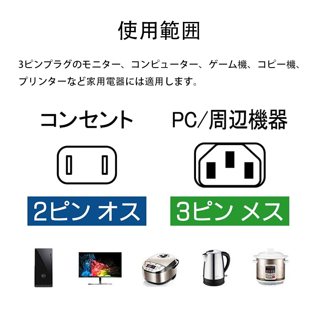 AC電源ケーブル 3ピンソケット(メス)⇔2ピンプラグ(オス) パワーコード 変換 3P-2P (アース線付き)定格7A-125V 電源コード 1.5m。 【パラメータ】線芯:純銅質3×0.75 mm2。 定格値:7A-125V。 長さ:1.5メートル。 【プラグ仕様】ACアダプター側:3ピンソケット(メス)、ACコンセント側:2ピン(アース線付き)プラグ(オス)。 この製品は電気用品安全法(PSE規格)の認証を取得した。 【使用範囲】:3ピンプラグのモニター、コンピューター、ゲーム機、コピー機、プリンターなど家用電器には適用します。 S000-K1007