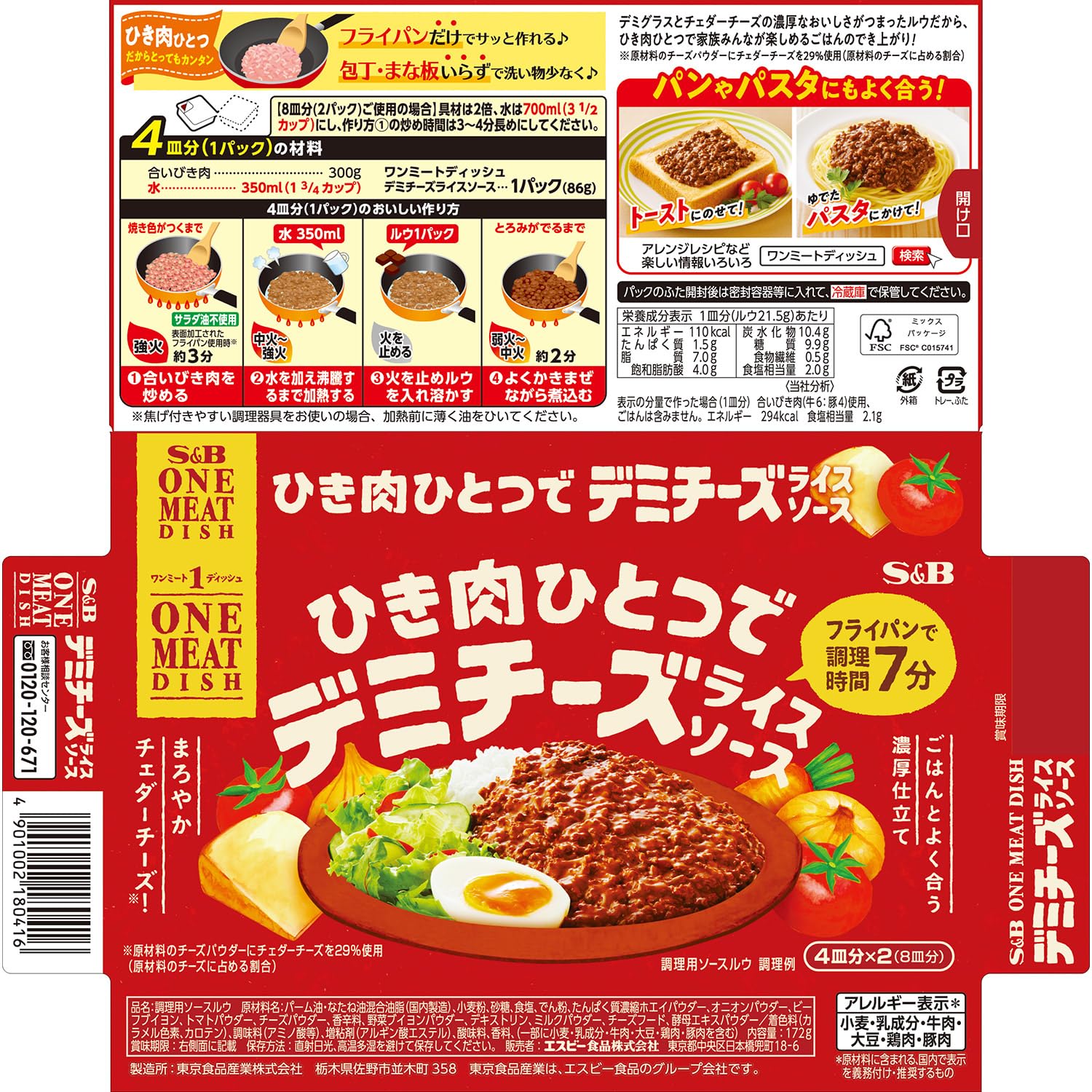 エスビー食品 ワンミートディッシュ デミチーズライスソース 172g×5個。 商品紹介 材料はひき肉ひとつだけ!フライパンで調理時間は7分。 時短性と簡便性を兼ね備えたルウです。 香味野菜の旨みたっぷりのデミグラスソースにチェダーチーズが香る、 家族みんなで楽しめる濃厚な味わいです。 原材料・成分 パーム油・なたね油混合油脂(国内製造)、小麦粉、砂糖、食塩、でん粉、たんぱく質濃縮ホエイパウダー、オニオンパウダー、ビーフブイヨン、トマトパウダー、チーズパウダー、香辛料、野菜ブイヨンパウダー、デキストリン、ミルクパウダー、チーズフード、酵母エキスパウダー/着色料(カラメル色素、カロテン)、調味料(アミノ酸等)、増粘剤(アルギン酸エステル)、酸味料、香料、(一部に小麦・乳成分・牛肉・大豆・鶏肉・豚肉を含む)。 材料はひき肉ひとつだけ!フライパンで調理時間は7分。 時短性と簡便性を兼ね備えたルウです。 香味野菜の旨みたっぷりのデミグラスソースにチェダーチーズが香る、家族みんなで楽しめる濃厚な味わいです。 S000-K9999