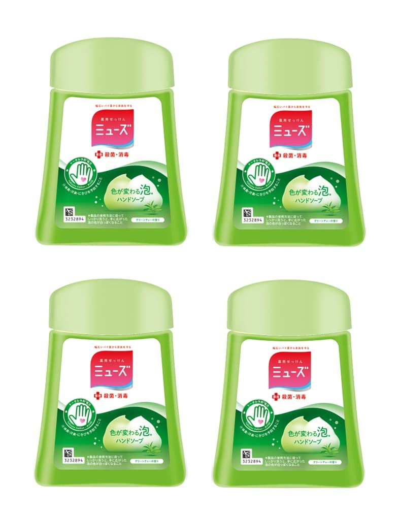 【医薬部外品】 MUSE ミューズ ハンドソープ 泡 詰め替えノータッチ 自動 ディスペンサー グリーンティー 250ml ×4個 殺菌 消毒 除菌。 商品紹介 薬用せっけんミューズ 1953年発売以来、幅広いバイ菌から家族を守ることを目指してきたせっけん・ハンドソープブランド。 薬用せっけんミューズ ノータッチ 泡ハンドソープ グリーンティーの香り 幅広いバイ菌・ウイルスを殺菌・消毒・除菌するハンドソープです。 トイレや洗面所での普段使いで手をキレイに保ちます。 自動ソープティスペンサー使用 ノータッチで泡が出てくるので周りを汚さず、素早く除菌。 インフルエンザや風邪などの流行時期やノロウイルスや食中毒の季節にも。 豊かな泡立ちですっきりとした洗い上がり。 毎日のうがい手洗い・手指消毒習慣に。 保湿成分ヒアルロン酸配合で優しい洗い上り グリーンのシャボンの色が白くなったら手を洗っているサイン。 手肌を清潔・クリーンに。 本体+詰め替えのあわせ買いがお得です。 殺菌成分配合でお子様の手洗いで菌を寄せ付けません 植物由来洗浄成分・低刺激性・アレルギーテスト済み。 医薬部外品。 商品紹介 『薬用せっけんミューズノータッチ泡ハンドソープ自動ディスペンサー』にセットして使用できる薬用ハンドソープです。 本体にセットしてノズルの下に手をかざすと、手洗い約1回分(約1ml)が出てきます。 ポンプを押す必要がないため衛生的で、いつでも簡単に手が洗えます。 幅広いバイ菌をしっかり殺菌・消毒するとともに、3つの保湿成分(ヒアルロン酸・ビタミンC誘導体・植物抽出成分)が手肌のカサつきを防ぎます。 さわやかなグリーンティーの香りで毎日の手洗い習慣を楽しく。 【医薬部外品】 使用上の注意 傷、湿疹、皮フ炎(かぶれ・ただれ等の皮フ障害があるときには、悪化させるおそれがありますので使用しないでください。 使用中にかぶれたり、刺激等の異常を感じたときには使用を中止してください。 症状が残る場合は専門医にご相談ください。 目に入ったときにはすぐに充分洗い流してください。 症状が残る場合は専門医に相談してください。 乳幼児の手の届かない場所に置いてください。 高温多湿になる場所に置かないでください。 原液が金属や洗面台に付着して長時間放置されると、まれに変色など起こしたり表面を傷める場合がありますので、取り除いてください。 用途以外に使用しないでください。 ディスペンサー、ボトルを分解しないでください。 防水加工ではありません。 水の中に浸したり、流水にあてたりしないでください。 丸洗いできません。 持ち上げたりする際は、スイッチをOFFにしてください。 スイッチがONの状態で本体を持ち上げたりセンサー周辺に触れたりすると、センサーが感知することがあります。 ディスペンサーを設置した洗面台等のお掃除の際は、誤ってハンドソープを出してしまうのを防止するため、電源を切ってください。 直射日光の当たるところに置かないでください。 長時間使用しない場合、石けんがノズル付近で固まることがあります。 使用上の注意 傷、湿疹、皮フ炎(かぶれ・ただれ等の皮フ障害があるときには、悪化させるおそれがありますので使用しないでください。 使用中にかぶれたり、刺激等の異常を感じたときには使用を中止してください。 症状が残る場合は専門医にご相談ください。 目に入ったときにはすぐに充分洗い流してください。 症状が残る場合は専門医に相談してください。 乳幼児の手の届かない場所に置いてください。 高温多湿になる場所に置かないでください。 原液が金属や洗面台に付着して長時間放置されると、まれに変色など起こしたり表面を傷める場合がありますので、取り除いてください。 用途以外に使用しないでください。 ディスペンサー、ボトルを分解しないでください。 防水加工ではありません。 水の中に浸したり、流水にあてたりしないでください。 丸洗いできません。 持ち上げたりする際は、スイッチをOFFにしてください。 スイッチがONの状態で本体を持ち上げたりセンサー周辺に触れたりすると、センサーが感知することがあります。 ディスペンサーを設置した洗面台等のお掃除の際は、誤ってハンドソープを出してしまうのを防止するため、電源を切ってください。 直射日光の当たるところに置かないでください。 長時間使用しない場合、石けんがノズル付近で固まることがあります。 原材料・成分 有効成分:サリチル酸その他の成分:高重合PEGPOEラウリルエーテル硫酸アンモニウム液ヤシ油脂肪酸アミドプロピルベタイン液濃グリセリンエデト酸塩ヤシ油脂肪酸ジエタノールアミドPOE(17)POP(17)ブチルエーテルヒドロキシメトキシベンゾフェノンスルホン酸ヒアルロン酸Na-2ビタミンCリン酸Mgチャエキス(1)メチルクロロイソチアゾリノン・メチルイソチアゾリノン液クエン酸NaPOE・ジメチコン共重合体クエン酸エタノール精製水香料緑201黄4だいだい205。 在庫状況によ