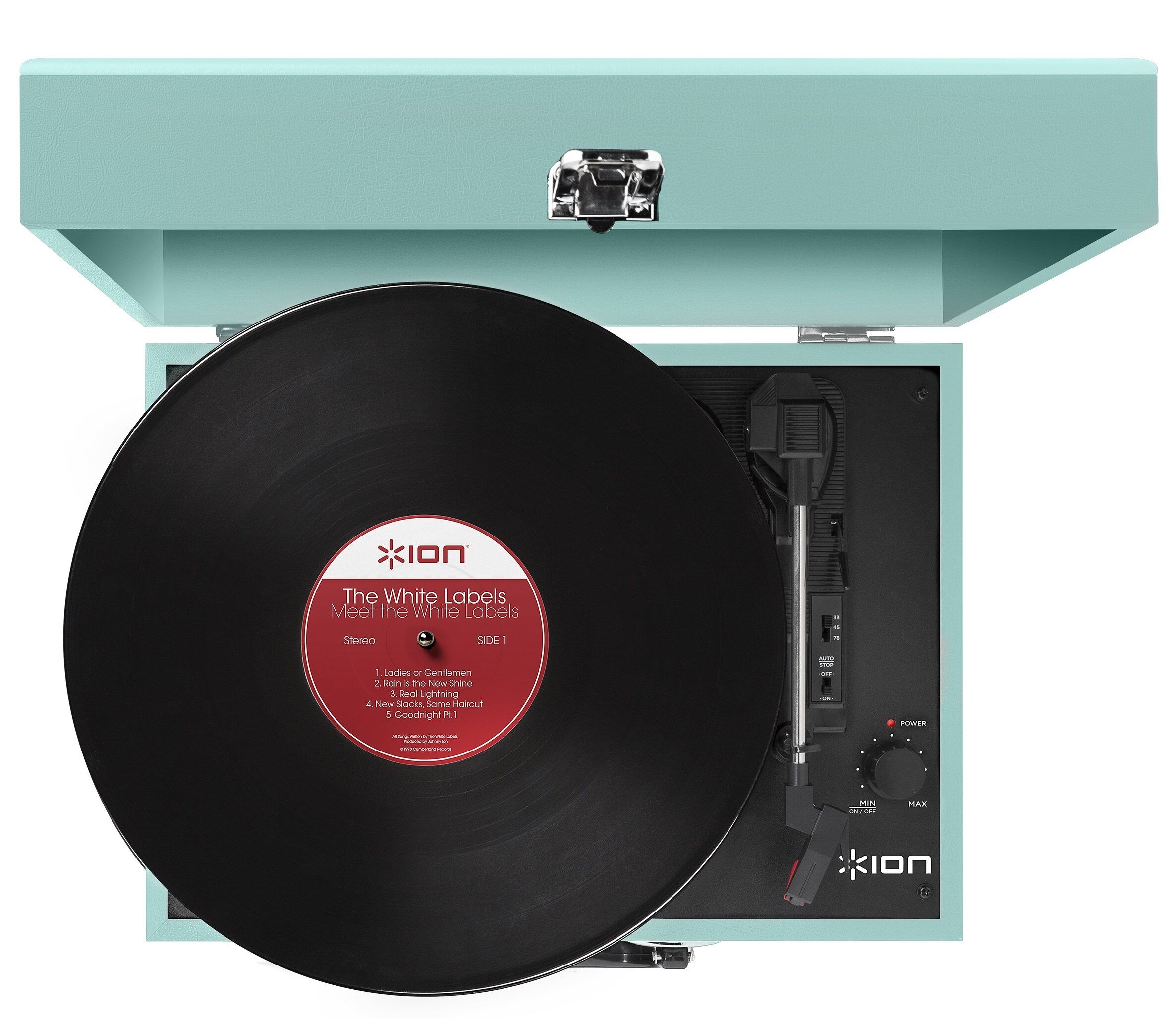 ION Audio ポータブルレコードプレーヤー スーツケース型 スピーカー内蔵持ち運び 電池でも稼働 Vinyl Transport 水色。 Vinyl Transportは、どこか懐かしいレトロなデザインのスーツケース型レコードプレーヤーです。 あなたの好きな場所どこへでも持ち運びができ、お気に入りのレコードが楽しめます。 スーツケース型の持ち運びができるレコードプレイヤー、スピーカー搭載でこれ一台でレコードが楽しめる。 単三電池稼働またはACアダプターで稼働、外に持ち出す、使わない時は収納したい方におすすめ。 お手持ちのコンポなどに接続可能な標準的なRCA出力端子搭載。 曲のジャンルやお好みに応じて、ターンテーブルの再生速度を選べる(33-1/3、45、78回転対応)。 レコードの終わりに再生が自動停止するオートストップ機能。 S800-K9999