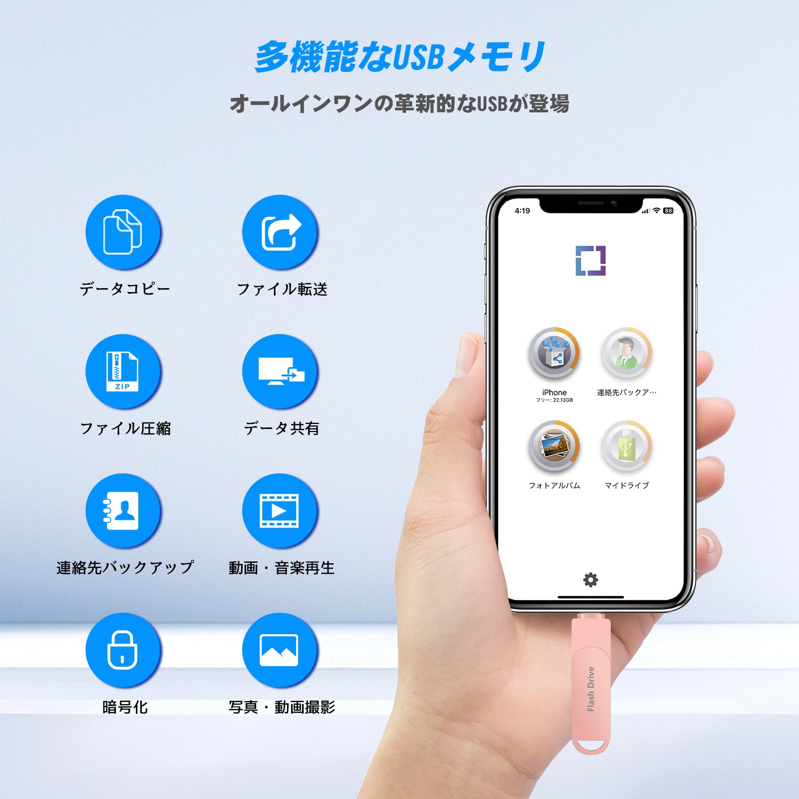 【2025年登場】Phone usbメモリ phone/android/PC対応 USBメモリー フラッシュドライブ Lightning/type-cコネクタ搭載 容量不足解消Phone/iPad/iPod/Win/Mac兼用/ Phone16/15/ 14/13 /12 (Pink, 256, GB) 10/08更新 | karuamiruku