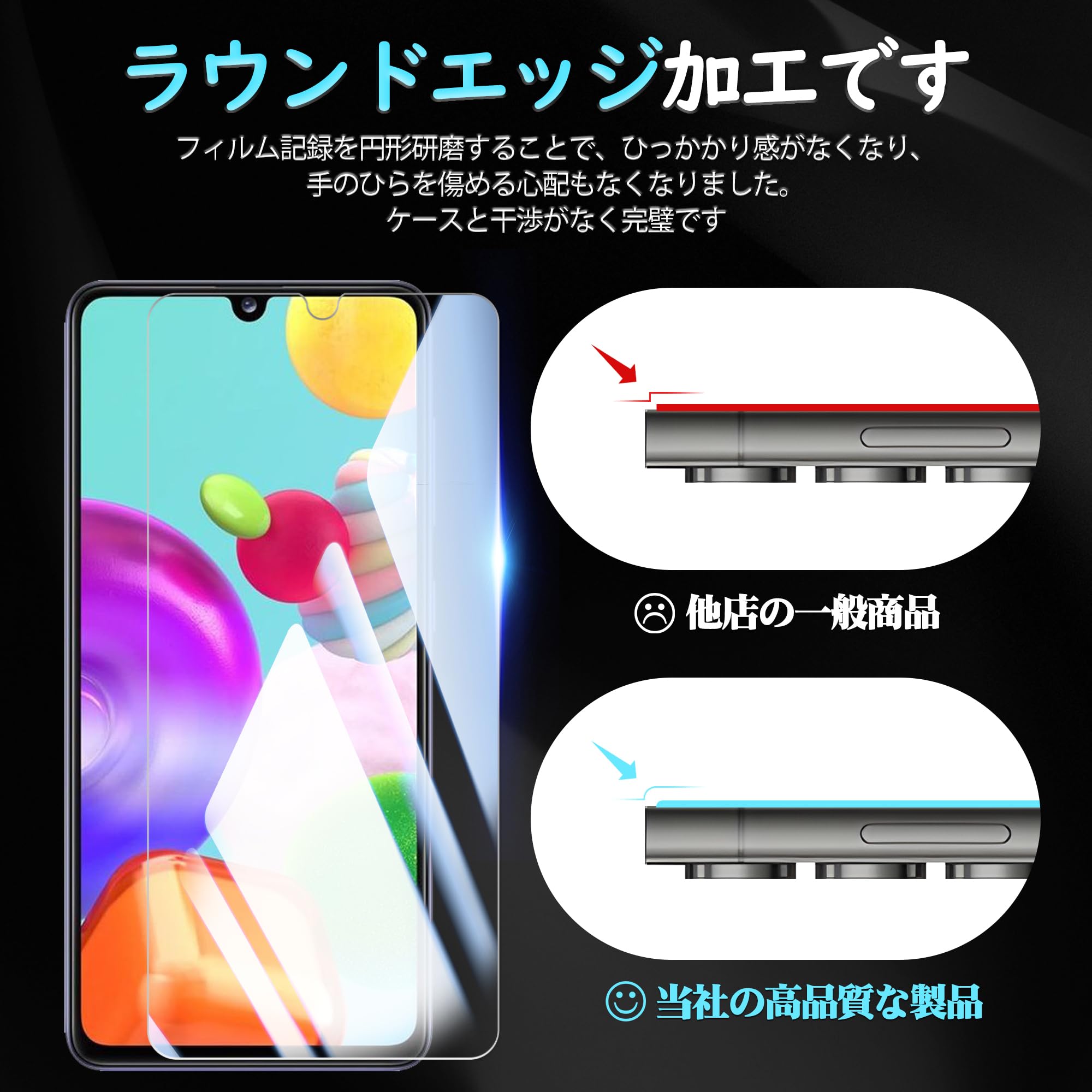 【2枚 指紋認証 対応】KPNS 日本素材製 強化ガラス Galaxy A41 SC-41A SCV48 用 ガラスフィルム 強化ガラス カバー 保護フィルム。 【よくある問題】 1. 貼り付けた後、ホコリが入っる場合はどうすればいいでしょうか? 強化ガラスを割れないように一気に剥がした後に、セロハンテープや同梱のラベルシートでホコリを取り除き再度丁寧に位置を合わせながら貼って下さい。 2. 気泡が1円玉サイズで残った場合はどうすればいいでしょうか? 画面を擦っても圧着出来ない場合が多いので、 この場合は、じわじわと剥がして、 再度貼り付けるとキレイになります。 位置のズレやほこりなどが入っておらず、気泡が抜け切らない場合は貼りなおさずに1週間ほど放置していただきますと自然になくなります。 【対応機種】:Galaxy A41 SC-41A SCV48専用ガラスフィルム。 【注意】この電話の画面の端は湾曲しているため、保護フィルムのサイズが丁度良い場合、しっかりと貼り付けられず、白いエッジやシェルとの干渉などの問題があるため、保護フィルムは画面よりも小さいです。 【9H硬度・日本製ガラス素材】日本旭硝子製ガラス素材採用 最上級強度のガラスを使用し表面硬度は9H。 万が一スマホを落としてガラスが割れても、 ガラス破片が飛び散らないような安心設計。 ” 飛散防止 ” が、ガラス破片から守ります。 【99%の高透過率】:画質を徹底して追求するため、最高級のガラスを選択し、99%透過率を実現しました。 透き通ったガラスフィルムに多層フィルタフィルムを採用し、素晴らしい透明度を確保して、一体感になって、まるで貼っていないみないような感覚で携帯の美しさはそのままにお楽しみいただけます。 【指紋防止、高感度タッチ】ガラスフィルムには撥油コーティングが施されており、指紋や汚れなどに強くなめらかな操作感を実現、付着した汚れなどは簡単に拭きとれます。 こちらは高耐久撥油コーティングが施され、つるつるな滑り感を実現!ゲームしても渋くなし!。 【気泡防止・貼付け簡単】気泡防止加工が施されているので、気泡が入りにくい。 万が一気泡が入ってしまっても時間が経てば徐々に抜けるので 美しい仕上がりに。 ガラスを液晶に置くだけで自然に吸着、簡単に気泡が抜いて行くので、誰でも簡単、綺麗に貼ることができます。 フィルム貼りことが苦手の方でも簡単に貼る事が可能です。 S000-K9999