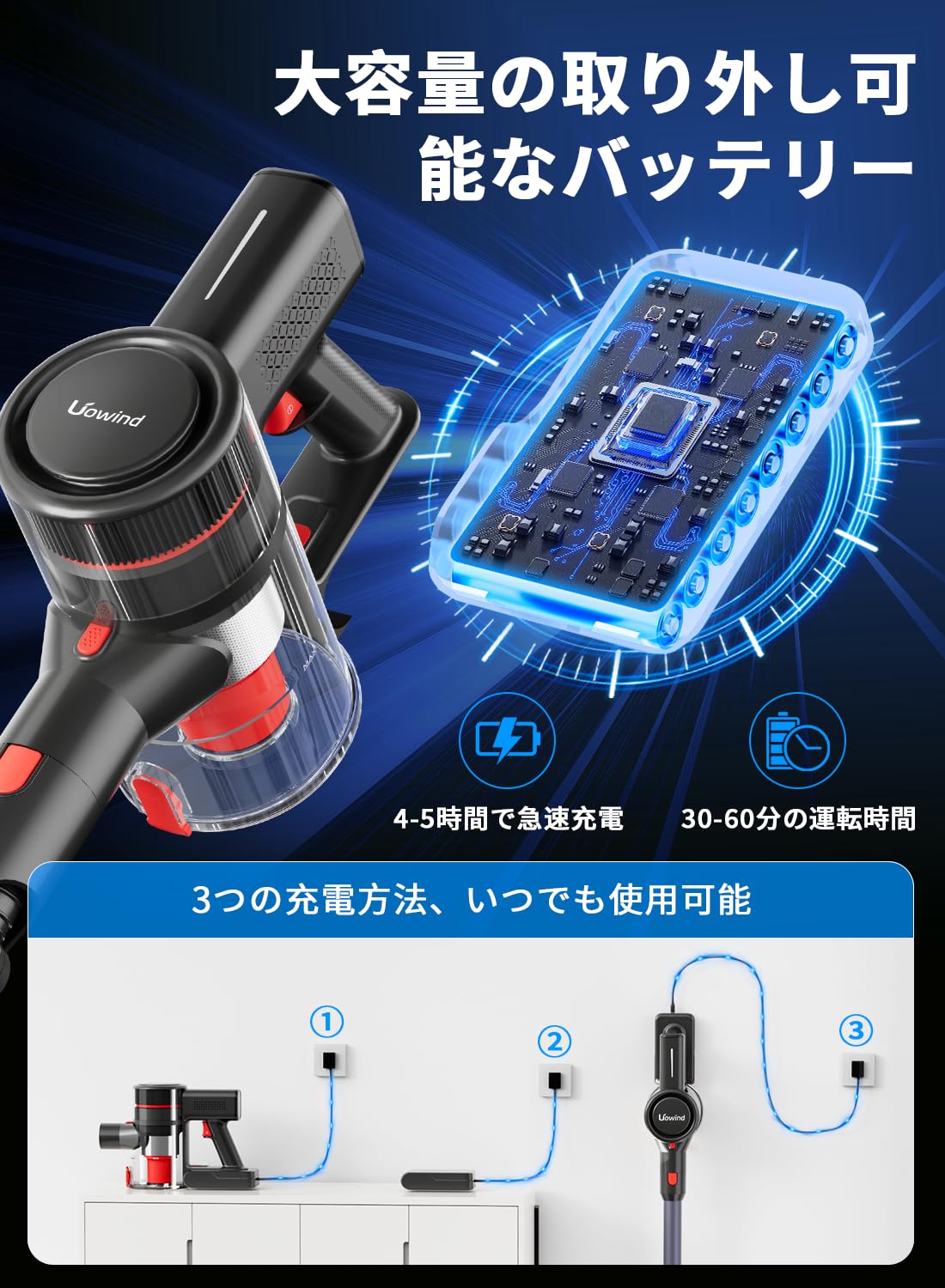 掃除機コードレス ハンディクリーナー 300AW 超強力吸引 充電式スティッククリーナー 布団クリーナー 65分連続稼働 4種類のノズル(布団ダニ取りブラシ含む) 伸縮延長パイプ 着脱式バッテリー 超軽量 そうじき LEDライト付き 7重濾過 HEPAフィルター 静音設計 カーペット カーテン ソファ 車用 家庭用 一人暮らし 母親と子供が簡単に使える 日本語取扱説明書 PSE認証済み。 【300AW強吸引力&操作はボタンひとつで】Uowind 掃除機コードレス 超強力モーターが搭載されており、最大55KPaの吸引力をサポートし、フローリングの溝の吸引力は従来の5倍と、デスクの埃やゴミはもちろん、カーペットに入り込んだ砂や土などもしっかり吸い取れます。 電源ON/OFFや運転モード切り替えは、強弱3段階モード,たった1つのボタンですべて操作できるシンプルな使用感が魅力です。 多様なアクセサリーを付属し、一台でテーブルの上や階段、車の中など、お掃除したい場所によって使い分けることができます。 【コードレス設計 2way仕様&多様なノズル付き】Uowind 掃除機コードレス スティッククリーナーとしてもハンディクリーナーとしても使用可能な2WAY仕様で、使用場所に応じて最適な使い方が選べます。 この掃除機には、豊富なアタッチメントが付属しており、床用ノズル、隙間ノズル、ブラシ付きノズル、延長パイプ、ソファ用ノズルなど、様々な清掃シーンに対応します。 90°から180°まで調整可能な清掃角度により、あらゆる場所の清掃が簡単です。 家庭やオフィス、車内など、どんな場所でも快適に使えるデザインで、清掃作業を楽に行えるのが特徴です。 これらの多機能アタッチメントを使って、隅々まできれいにしましょう。 1台多役を実現、目的別に掃除機を何台も買う必要はありません。 【65分まで長時間稼働& 低騒音】手軽さと充実のお掃除性能を両立した掃除機コードレス式「Uowind Z16」は、ボタンひとつで交換できる大容量リチウムイオン着脫式バッテリーを採用しています。 そして、騒音最適化エンジニアリングにより、Maxモードでも約60dBの静音性を実現しました。 一回満充電すれば、最長65分間安定したパワフルな電力を供給し、家中をしっかり掃除できます。 急速充電で約4時間でフル充電できます。 家族やペットに迷惑をかけずに掃除ができます。 一人暮らしから一戸建てまでどんなご家庭でも大活躍!掃除が楽になり、シンプルになります。 【 7重濾過システム&ワンタッチゴミ捨て 】 スティック掃除機7層強力濾過サイクロンシステムを採用して、遠心力で「ゴミ」と「空気」を確実に分離して集塵できます。 人気 掃除機コードレスは高度なサイクロン除塵技術と高性能HEPAフィルターシステムと組み合わて、微細なホコリを99.9%除去し、二次空気汚染を排除し、いつでもどこでも家の中を清潔に保てます。 HEPAフィルターは洗浄・乾燥させて再利用することで、掃除の効果を高め、長持ちさせることができます。 ダストカップユニットの汚れが気になるときは、分解して水洗いを。 1.5Lの大容量ダストカップで、ゴミ捨て回数や手間もを軽減。 ワンタッチで簡単に空にでき、お手入れ簡単、手を汚しません。 デスクの埃やゴミはもちろん、カーペットに入り込んだ砂や土などもしっかり吸い取れます。 【 軽量設計&快適に使える】このスティッククリーナーは、片手でも楽に操作できます。 その軽さは長時間の使用でも疲れを感じにくく、階段や高い場所の掃除も容易にこなせます。 軽量かつコンパクトなので、持ち運びも簡単で、家の中だけでなく車内の清掃にもぴったりです。 また、収納スペースを有効活用できるコンパクト設計により、場所を取らずに保管できます。 家庭用だけでなく、オフィスでも便利に使えるデザインで、どんな場所でも快適に使えます。 これ一台で、家全体を清潔に保ちましょう。 【予備用充電アダプターの製品番号:B0DWXKY4M5】。 【予備用バッテリーの製品番号:B0F6CPBQ8J】。 S000-K9999