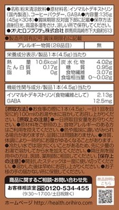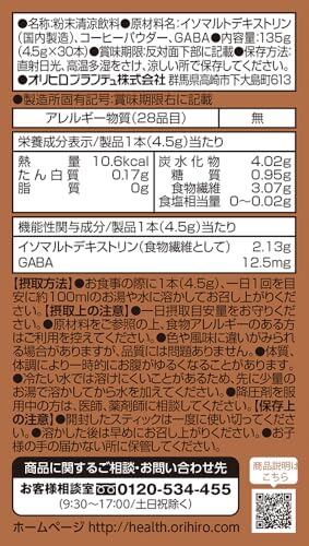 ORIHIRO(オリヒロ) 賢人の珈琲 イソマルトデキストリン GABA 配合 黒 コーヒー135g(4.5g×30本)。 商品紹介 イソマルトデキストリン&GABAの2つの機能性関与成分を配合した機能性表示食品 手軽に利用できる粉末コーヒー 一日1本(4.5g)をお湯やお水に溶かして食事と共にお召し上がりください。 溶けやすい粉末コーヒーですので、手軽にご利用いただけます。 使用上の注意 摂取方法・摂取上の注意 お食事の際に1本(4.5g)、一日1回を目安に約100mlのお湯や水に溶かしてお召し上がりください。 一日の摂取目安量をお守りください。 原材料をご参照の上、食物アレルギーのある方はご利用を控えてください。 色や風味に違いがみられる場合がありますが、品質には問題ありません。 体質、体調により一時的にお腹がゆるくなることがあります。 冷たい水には溶けにくいことがあります。 降圧剤を服用中の方は、医師、薬剤師に相談してください。 注意事項 本品は、疾病の診断、治療、予防を目的としたものではありません。 本品は、疾病に罹患している者、未成年者、妊産婦(妊娠を計画している者を含む。 )及び授乳婦を対象に開発された食品ではありません。 疾病に罹患している場合は医師に、医薬品を服用している場合は医師、薬剤師に相談してください。 体調に異変を感じた際は、速やかに摂取を中止し、医師に相談してください。 原材料・成分 イソマルトデキストリン(国内製造)、コーヒーパウダー、GABA ご注意(免責)>必ずお読みください 商品詳細 サイズ・容量 内容量:210g(4.5g×30 本) 入数:20×1 賞味期限:2年 規格【原材料】 イソマルトデキストリン、コーヒーパウダー、GABA 【栄養成分表示/製品1本(4.5g)中】 熱量 10.6kcal、たん白質 0.17g、脂質 0g、炭水化物 4.02g、糖質 0.95g、食物繊維 3.07g、食塩相当量 0-0.02g 【機能性関与成分/製品1本(4.5g)中】 イソマルトデキストリン 2.13g(食物繊維として)、GABA 12.5mg 注意事項【摂取方法・摂取上の注意】 お食事の際に1本(4.5g)、一日1回を目安に約100mlのお湯や水に溶かしてお召し上がりください。 一日の摂取目安量をお守りください。 原材料をご参照の上、食物アレルギーのある方はご利用を控えてください。 色や風味に違いがみられる場合がありますが、品質には問題ありません。 体質、体調により一時的にお腹がゆるくなることがあります。 冷たい水には溶けにくいことがあります。 降圧剤を服用中の方は、医師、薬剤師に相談してください。 【保存上の注意】 開封したスティックは一度に使い切ってください。 溶かした後は早めにお召し上がりください。 お子様の手の届かない所に保管してください。 イソマルトデキストリン&GABAの2つの機能性関与成分を配合した機能性表示食品。 機能性表示食品 届出番号:E851。 手軽に利用できる粉末コーヒー。 内容量:135g(4.5g×30本)。 商品サイズ (幅×奥行×高さ) :163mm×70mm×122mm。 S000-K9999