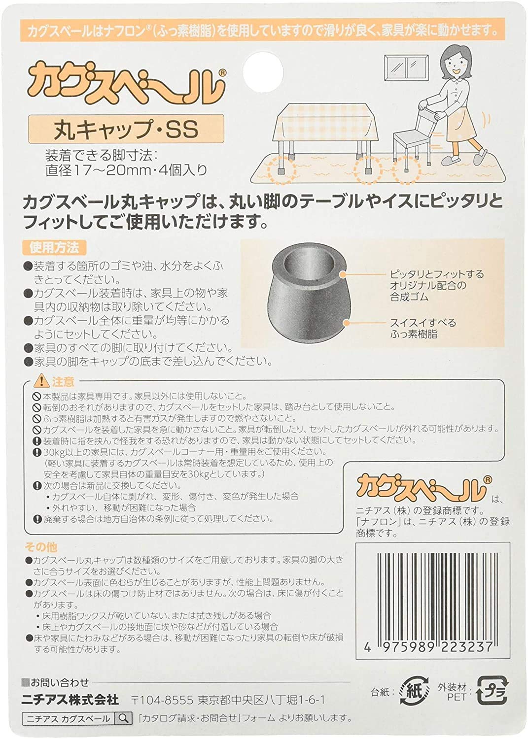 ニチアス カグスベール 丸キャップSS 4個入。 スイスイすべる、ふっ素樹脂製脚にあわせてセットする【はめ込みタイプ】テーブルや椅子、スチール家具など脚のガードも兼ねたい家具に。 【注意事項】家具などの移動以外には使用しないでください。 カグスベールをセットした家具などは、踏み台として使用しないでください。 床の傷つけ防止材ではありません。 床用樹脂仕上剤の拭き残しがある場合や、ホコリや砂などが付着している状態でカグスベールを動かすと床に傷がつく可能性があります。 製造国:日本。 内径:約17~20mmφ。 S000-K9999