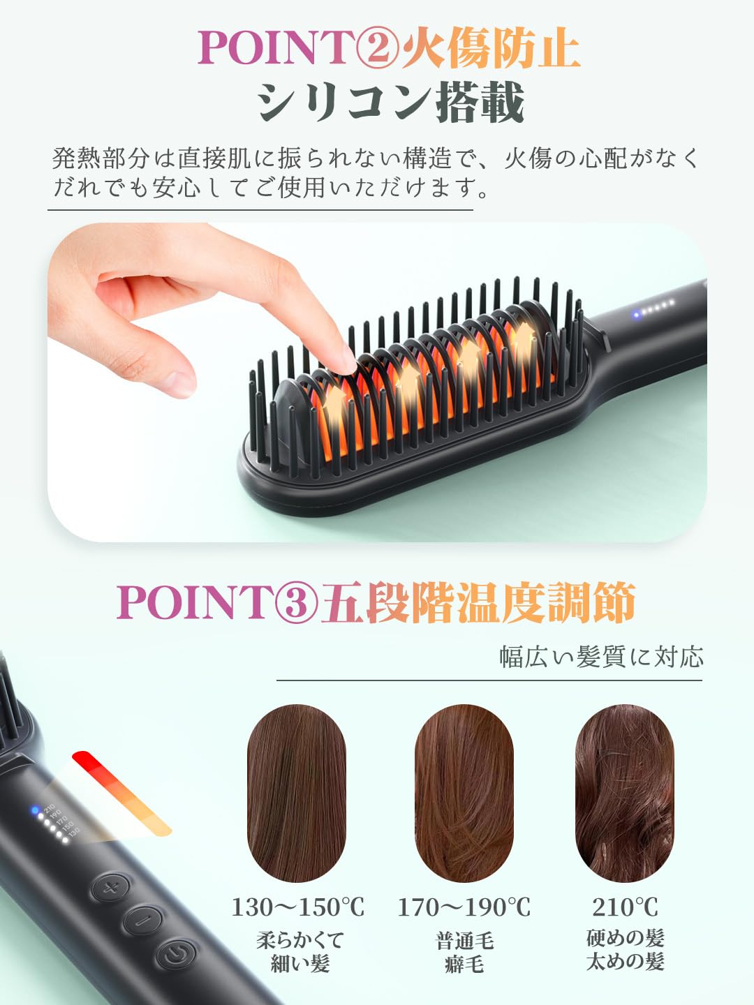 ヒートブラシ ストレート ヘアアイロンブラシ 2WAY ボリユームアップ/ヘアストレートアイロン やけど防止 電熱ヘアブラシ 210℃ プロ仕様 130℃~210℃ 5段階温度調節 60秒立ち上がり 乾湿両用 ブラシアイロン 男女兼用 家庭/旅行/出張/通勤/贈り物 プレゼント。 【やけど防止デザイン&60分自動シャットダウン】ヘアアイロンのようにプレートがむき出しでなく、発熱部分が直接肌に触れられない構造になっているため、やけどする心配がなく、子どもがいるご家族でも共用しやすい。 さらに60分操作しないと自動的に電源OFF機能も搭載し安'全性を確保しています。 【最速60秒立ち上げ 】PTCヒーターを搭載し、時間がない時でも急速加熱して、約60秒で使用可能になります。 朝の忙しい時、できるだけ短時間でクセを直したい方はこのブラシアイロン見逃さないでください。 【クシを使う感覚 & ストレート&ボリユ-ムアップ自由自在】柔らかいほくしピンも搭載、クシを使う感覚で使用できます。 ほくしピンはあらゆる角度から髪のからまリをキャッチし、ダメージを与えずにやさしくほくします。 と同時に、熱でクセを直し、ストレートヘアを生み出します。 使いたいときにサッと使えるので便利。 髪をまっすぐに整えられるのはもちろん、カールにしてボリューム感を出したりヘアアレンジを自由に楽しんだりもできます。 また、本体とコードのコネクトが360度回転できるので、邪魔せずスタイリングに集中できます。 【 マイナスイオンによるキューティクルを修復】スタイリング時の静電気を減少することができ、高濃度のマイナスイオンを発生します。 バサバサして広がる髪の悩みを解消して、サラサラでツヤのある髪を実現します。 また、セラミック加工のヒート部で、髪の水分を適度に保ち、枝毛や切れ毛を軽減します。 【5段階温度調節可能 & 髪が傷まない】130℃/150℃/170℃/190℃/210℃の5段階の温度調節が可能。 髪の硬さや用途、髪の傷み具合に合わせて温度を調整可能です。 ブラシアイロンなら髪を挟まずに整えられるので、ヘアアイロンと比べて髪が痛むことなく、初心者でも簡単に扱えます。 根元からしっかり髪をとかせば素早くくせ毛や寝ぐせを直せます。 S350-K9999