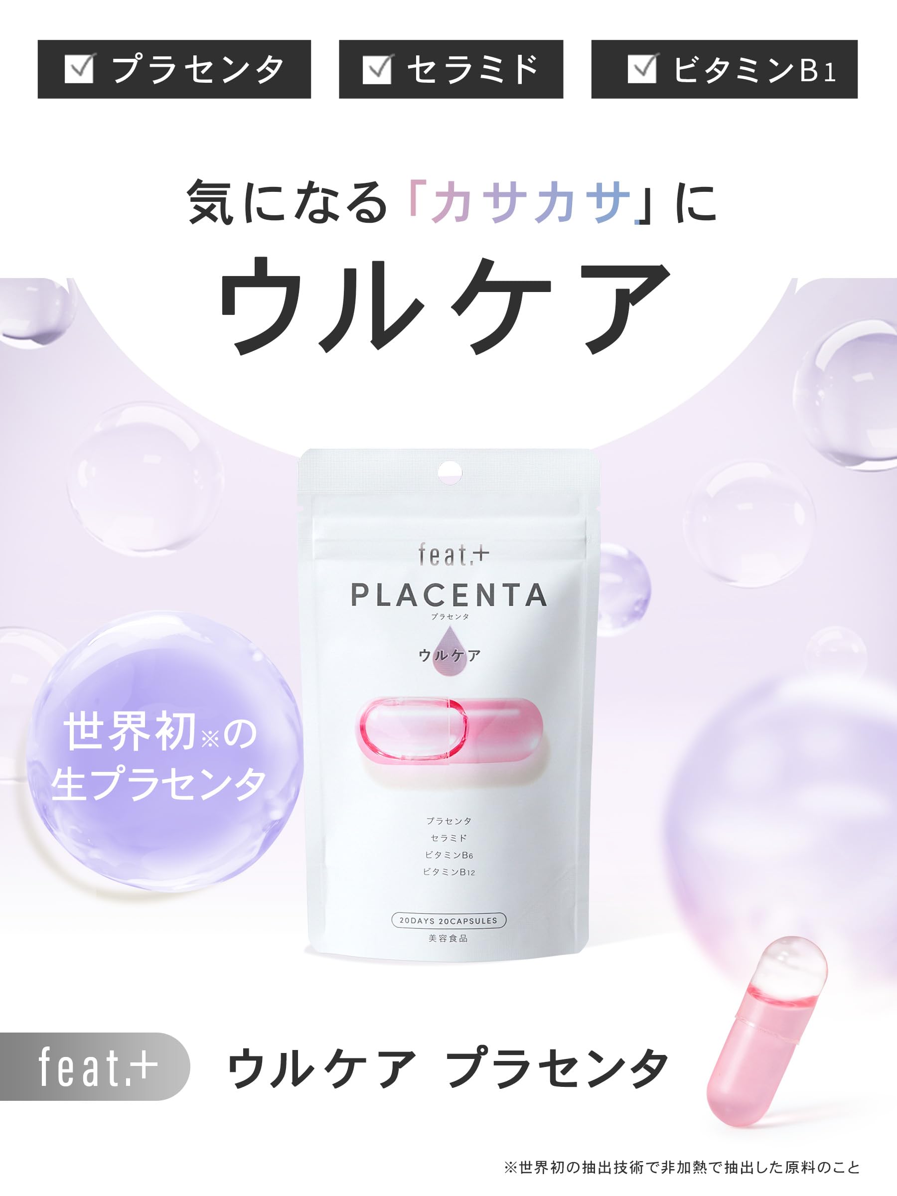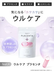 Feat. フィートプラス ウルケア [プラセンタ] 20粒 +。 商品紹介 ウルケアは、世界初の抽出技術で非加熱で抽出した生プラセンタが摂れる美容液設計のカプセルです。 その他加齢とともに減少するセラミドを配合しました。 キレイ習慣をサポートする、美容食品です。 食生活は、主食、主菜、副菜を基本に、食事のバランスを。 ※パッケージデザイン等は予告なく変更されることがあります 原材料・成分 プラセンタエキス(豚)(国内製造)、米胚芽抽出物/ベタイン、HPMC、ビタミンB12、ビタミンB6、ヒアルロン酸 【栄養成分表示 1粒(0.4272g)あたり】エネルギー:1.24 Kcal、たんぱく質:0.15g、脂質:0.001g、炭水化物:0.15g、s食塩相当量:0.0004g、ビタミンB6:5.0mg、ビタミンB12:15.0μg セラミド:300μg 使用方法 美容食品として、1日1粒を目安にお水やぬるま湯でお召し上がりください。 安全警告 ご注意:原材料をご参照のうえ、食物アレルギーがある方、妊娠・授乳中の方、疾病治療中の方の摂取はお控えください。 まれに体質に合わない方もございます。 お召し上がり前に表示及び説明文をよくお読みのうえ正しくお召し上がりください。 お召し上がり後体調のすぐれない場合はお召し上がりを中止してください。 開封後は、なるべくお早めにお召し上がりください。 植物由来の原料を使用しておりますので、色調等にばらつきがある場合がありますが、品質には問題はありませんので、安心してお召し上がりください。 ウルケアは、世界初の抽出技術で非加熱で抽出した生プラセンタが摂れる美容液設計のカプセルです。 その他加齢とともに減少するセラミドを配合しました。 キレイ習慣をサポートする、美容食品です。 食生活は、主食、主菜、副菜を基本に、食事のバランスを。 ※パッケージデザイン等は予告なく変更されることがあります。 S000-K9999