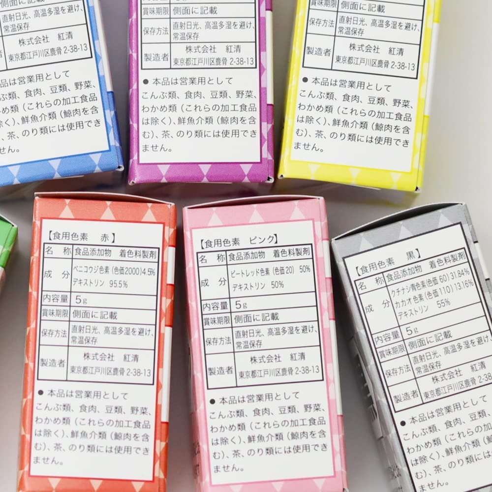 食用色素 天然由来の色粉 天然植物や海藻由来の 食用色素 7色セット(5g×7個) 赤・黄・青・緑・紫・ピンク・黒 紅清 家庭用天然色素。 天然色素を原料とした粉末の食用色素(着色料)です。 クリームやホイップ、冷菓、キャンディ、ケーキやクッキーの生地に、少量混ぜて華やかなデコレーション、カラフルなお菓子作りに大活躍です。 アイシングに少量まぜて、ドーナッツやクッキー、マフィンをカラフルにデコレーションすることも出来ます。 これがあれば、憧れのデパ地下カラフルスイーツもお家で作れますね。 ※この製品は水溶性のため、チョコレートなど油分の含まれているものには使用できません。 S000-K9999