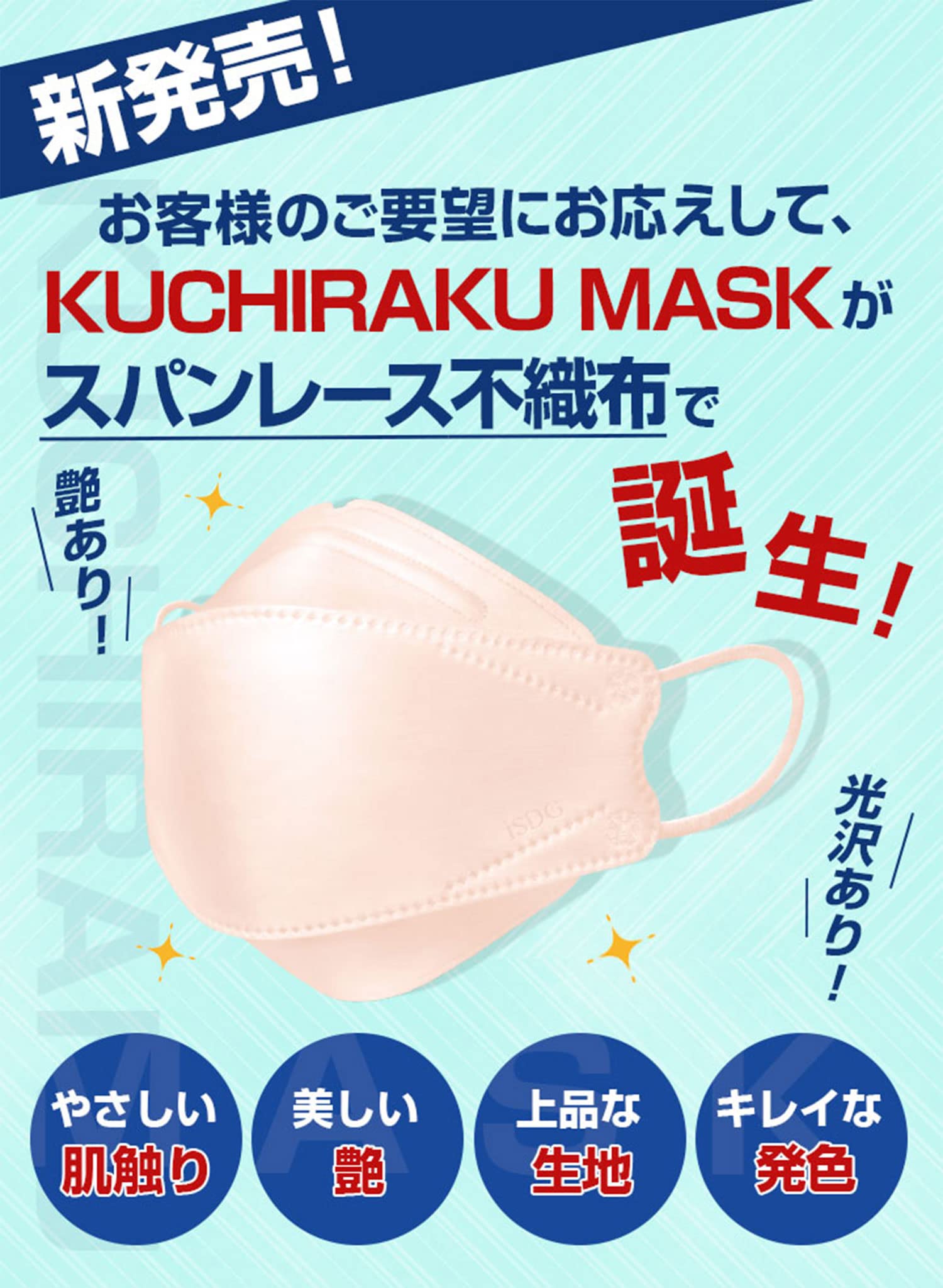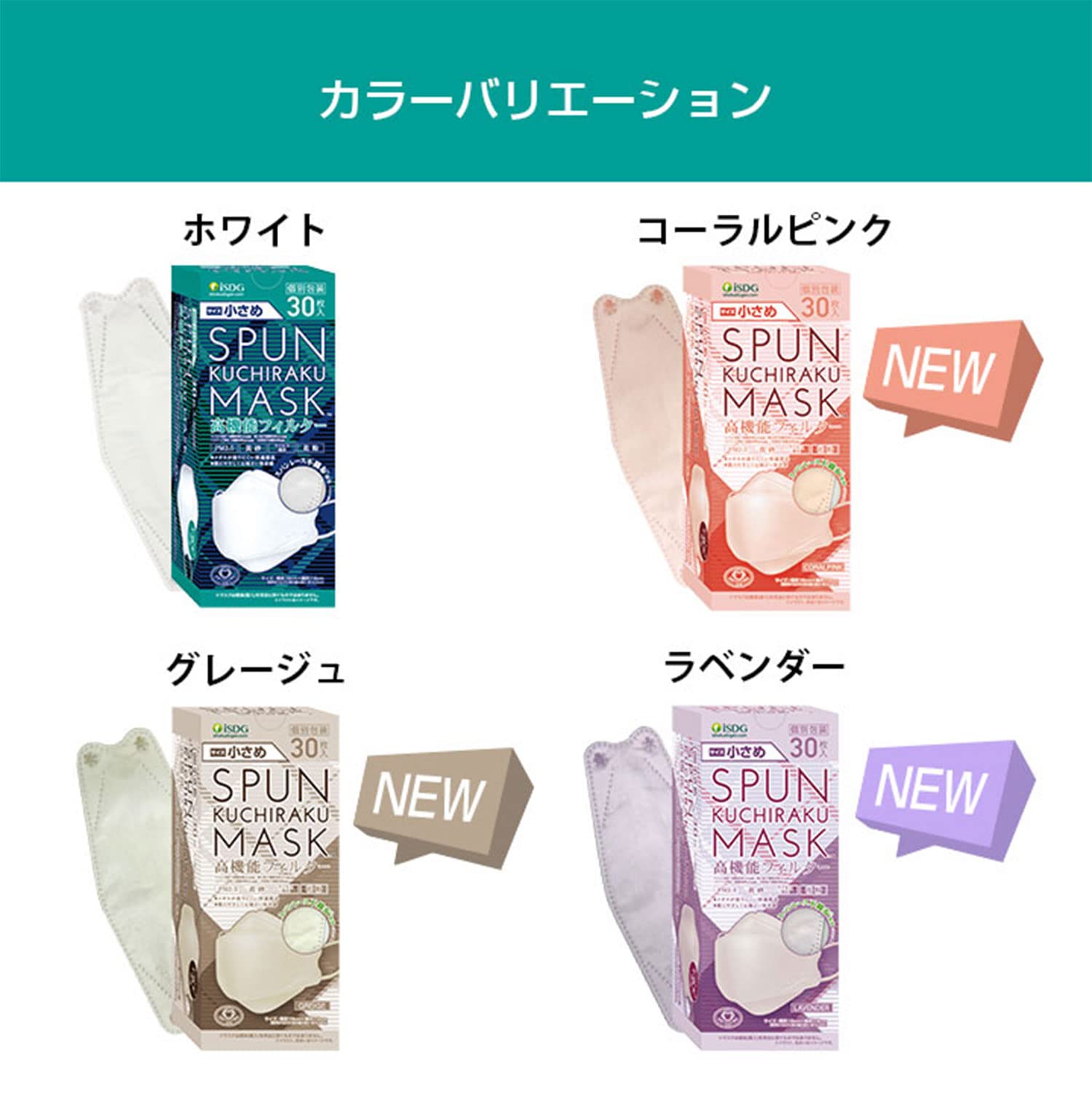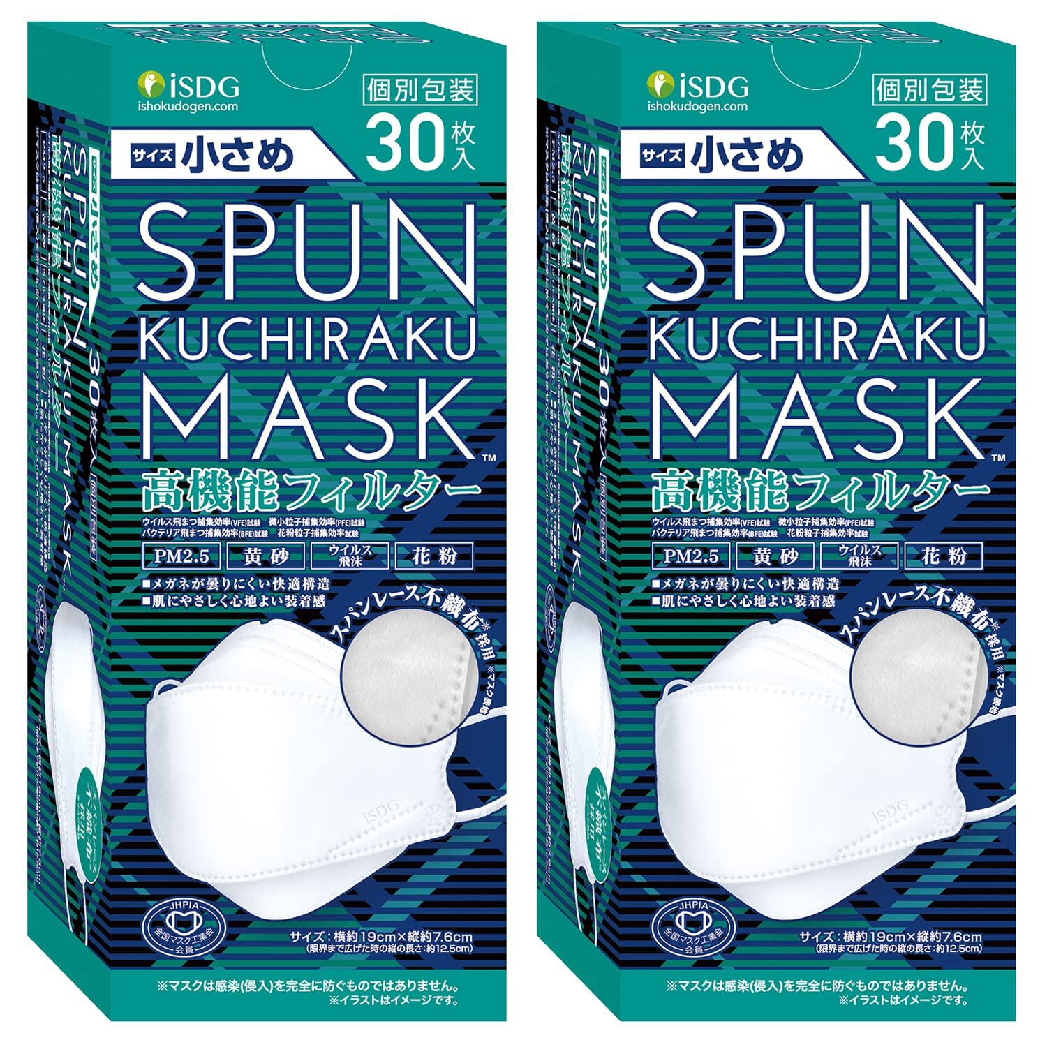 [医食同源ドットコム] iSDG 【60枚 30枚×2箱】 SPUN KUCHIRAKU MASK (スパンクチラクマスク) 小さめ 個包装 30枚入り ホワイト 30枚×2箱。 【カラー】ホワイト。 【フィルター性能】3層不織布高機能フィルター。 【サイズ】横約19cm×縦約7.6cm(限界まで広げた時の縦の長さ:約12.5cm)。 【表面素材】スパンレース不織布。 【特徴(素材)】バインダー(ボンド)を使用せず主に水の圧力でシート状にしたスパンレースマスクは一般の不織布には無い光沢と肌触りがあります。 一目で違いがわかる発色です。 【特徴(耳ゴム)】不織布マスクなのに、高発色にシルクのような光沢!機能にもこだわり、高機能不織布フィルターを使用。 耳ゴムにもこだわり、長時間の着用でもストレスの少ないふわふわ平ゴムを使用。 カラーマスクでは耳ゴムは白いものも多い中、耳ゴムまでこだわりの染色を行っています。 S350-K9999