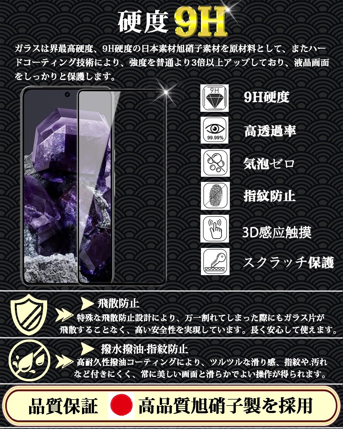 対応 Google Pixel 8 ガラスフィルム 全面保護 Pixel8 強化ガラス グーグル ピクセル8 液晶保護フィルム【2枚入り】日本製旭硝子製 指紋認証対応 硬度9H 飛散防止 気泡防止 撥水撥油 高透過率 自動吸着 衝撃吸収 干渉しない。 【指紋認証対応!対応機種】Google Pixel 8 全面保護 ガラスフィルム。 【注意】Pixel 8フィルムを正しく貼り付けた後に以前に登録された指紋を削除して新しい指紋をもう一度登録してください。 指紋認証が機能しない場合は、タッチ感度を上げる設定を行うことをお勧めします。 (取り付け後の指紋の位置に気泡がないように注意してください。 )。 【指紋防止!高感度タッチ】ガラスフィルムには撥油コーティングが施されており、指紋や汚れなどに強くなめらかな操作感を実現、付着した汚れなどは簡単に拭きとれます。 高品質な専用接着剤を採用し、どんな場合でも脱落の心配はありません、感度も落ちません、快適な操作感を実現します。 【気泡無しと!簡単貼り付け】は携帯電話 液晶保護のために設計され。 フィルム接着面に吸着に優れたシリコンコーティングを施しているので、気泡なしで貼る事が可能です。 ガラスを液晶に置くだけで自然に吸着、簡単に気泡が抜いて行くので、誰でも簡単、綺麗に貼ることができます。 【高透過率!極上のタッチ感】画質を徹底して追求した結果、透過率は99%以上実現しました。 液晶画面を守りながらスクリーン元々の鮮やかな画質を損なわなく、そのままに楽しみます。 3Dタッチ対応ためます。 本来のタッチ感で、快適な操作感を実現します。 見た目・触り心地ともに何も付けてない状態と殆ど変わりません!。 S000-K9999