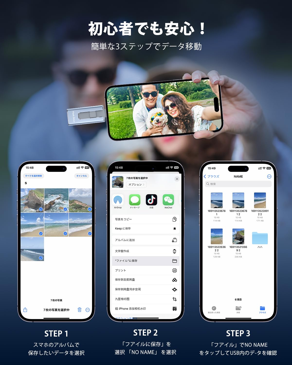 usbメモリ「アプリ不要 phone から 直接 usb に 写真 を 移す」phone対応 データ保存 移行 スマホ写真保存 u s b外付け US Bメモリ iOS/Type-C/U-SB-A/Micro USB搭載 大容量 フラッシュメモリ 高速 データバックアップ 外付けストレージ 携帯容量不足解消 iPad/PC/Macbook/P-hone対応 256GB ブルー。 【アプリ不要!Phoneから直接usbメモリに写真保存できる神アイテム】このPhone対応usbメモリは、専用アプリ不要で、PhoneやiPad、Androidスマホ、Windows PC、Macに直接接続できるため、複雑な設定やネット環境がなくてもPhoneの写真や動画を即座に保存できます。 操作も「接続→選択→保存」の簡単3ステップで、機械に不慣れな方でも使いやすいです。 Phoneてテータ保存usbとして、iCloudに頼らずに旅先や日常の思い出をスマートにバックアップできる便利なスマホusbメモリです。 【4in1搭載!これ一本でもType-Cも完全対応usbメモリ】 IOS、Type-C、USB-A、Micro USB搭載の4in1 usbメモリ。 iPhone 16シリーズ、iPad、Androidスマホ、Windowsパソコン、MacBookに幅広く対応ことが可能です!usbメモリ Type-C接続でAndroidスマホ外付けとしても便利で、最新のiPhone 18シリーズから、Samsung Galaxy、Xperia、Google Pixelまで幅広く使用可能です。 スライド式の小型usbメモリは、ポケットに入れても邪魔にならず、キーホルダーとして持ち運びも簡単。 外出先でもどのデバイスでもスムーズに使える万能usbメモリです。 コンパクトなスライド式でキーホルダー感覚で持ち運びOK。 【usb3.0超速転送!Phone写真・動画・データも秒速保存usbメモリ】このusbメモリはUSB 3.0技術を採用し、高速データ転送が可能です。 従来のUSB 2.0に比べて約10倍の速度で、写真・動画・ドキュメントを迅速に移動できます。 大量のPhone 写真や4K動画、ビジネス資料もサクサク移動ことが可能です。 重いデータもusbメモリで秒速バックアップでき、スマホのストレージもスッキリ快適に。 例えば、プレゼン資料や仕事用ファイルもusbメモリにまとめれば、共有も再生もスムーズ。 旅行中の6K動画、イベントの撮影データ、SNS用素材などもusbメモリに保存して、スマホのストレージをスッキリさせましょう。 【容量不足解消!大切な思い出も趣味もusbメモリに保存】Phoneスマホのストレージ容量がいっぱいになりがちな今、usbメモリは理想的な解決策です。 Phone写真保存 USBとして、最大514GBの超大容量を誇るこのusbです。 ペットの成長を記録したり、推しのライブ映像やファンミーティングの動画を保存したりと、日常や趣味のデータも安心して保存できます。 容量不足の心配なく、自由に撮影・保存が可能です。 スマホの動作を軽く保ちながら、思い出も趣味もたっぷり保存できる頼れるスマホ usbメモリです。 S000-K9999