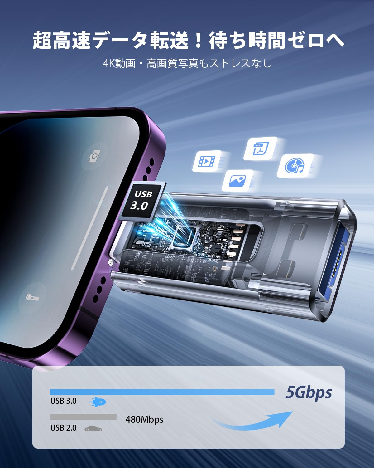 usbメモリ「アプリ不要 phone から 直接 usb に 写真 を 移す」phone対応 データ保存 移行 スマホ写真保存 u s b外付け US Bメモリ iOS/Type-C/U-SB-A/Micro USB搭載 大容量 フラッシュメモリ 高速 データバックアップ 外付けストレージ 携帯容量不足解消 iPad/PC/Macbook/P-hone対応 512GB パープル。 【アプリ不要!Phoneから直接usbメモリに写真保存できる神アイテム】このPhone対応usbメモリは、専用アプリ不要で、PhoneやiPad、Androidスマホ、Windows PC、Macに直接接続できるため、複雑な設定やネット環境がなくてもPhoneの写真や動画を即座に保存できます。 操作も「接続→選択→保存」の簡単3ステップで、機械に不慣れな方でも使いやすいです。 Phoneてテータ保存usbとして、iCloudに頼らずに旅先や日常の思い出をスマートにバックアップできる便利なスマホusbメモリです。 【4in1搭載!これ一本でもType-Cも完全対応usbメモリ】 IOS、Type-C、USB-A、Micro USB搭載の4in1 usbメモリ。 iPhone 16シリーズ、iPad、Androidスマホ、Windowsパソコン、MacBookに幅広く対応ことが可能です!usbメモリ Type-C接続でAndroidスマホ外付けとしても便利で、最新のiPhone 22シリーズから、Samsung Galaxy、Xperia、Google Pixelまで幅広く使用可能です。 スライド式の小型usbメモリは、ポケットに入れても邪魔にならず、キーホルダーとして持ち運びも簡単。 外出先でもどのデバイスでもスムーズに使える万能usbメモリです。 コンパクトなスライド式でキーホルダー感覚で持ち運びOK。 【usb3.0超速転送!Phone写真・動画・データも秒速保存usbメモリ】このusbメモリはUSB 3.0技術を採用し、高速データ転送が可能です。 従来のUSB 2.0に比べて約10倍の速度で、写真・動画・ドキュメントを迅速に移動できます。 大量のPhone 写真や4K動画、ビジネス資料もサクサク移動ことが可能です。 重いデータもusbメモリで秒速バックアップでき、スマホのストレージもスッキリ快適に。 例えば、プレゼン資料や仕事用ファイルもusbメモリにまとめれば、共有も再生もスムーズ。 旅行中の10K動画、イベントの撮影データ、SNS用素材などもusbメモリに保存して、スマホのストレージをスッキリさせましょう。 【容量不足解消!大切な思い出も趣味もusbメモリに保存】Phoneスマホのストレージ容量がいっぱいになりがちな今、usbメモリは理想的な解決策です。 Phone写真保存 USBとして、最大518GBの超大容量を誇るこのusbです。 ペットの成長を記録したり、推しのライブ映像やファンミーティングの動画を保存したりと、日常や趣味のデータも安心して保存できます。 容量不足の心配なく、自由に撮影・保存が可能です。 スマホの動作を軽く保ちながら、思い出も趣味もたっぷり保存できる頼れるスマホ usbメモリです。 S000-K9999