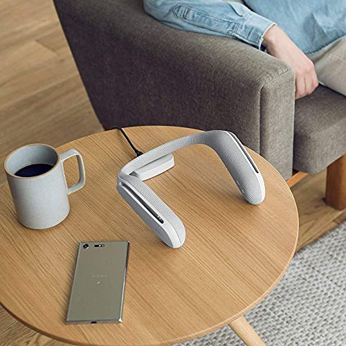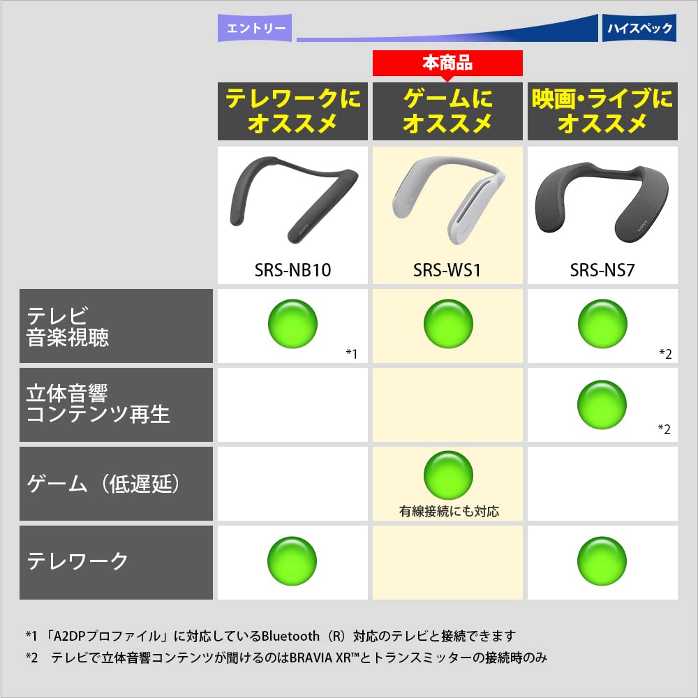 ソニー(SONY) ウェアラブルネックスピーカー テレビ/映画/ゲーム用スピーカー 音連動バイブレーション機能付き 2017年モデル SRS-WS1。 専用に開発されたΦ30mm口径のフルレンジスピーカーユニットを左右に搭載。 分割振動を起こしにくく高音域の再生に優れる小口径振動板を搭載し、首回りに配置することで小型ながらもパワフルな視聴体験空間を実現しています。 左右それぞれのスピーカーに低音を増強する振動板「パッシブラジエーター」を搭載。 映画のアクションシーンやライブ映像のドラム・ベースの低音部分が振動として再生。 耳に入る音と振動が一体になるため、コンパクトなサイズながらも、まるでその場にいるかのような、迫力のある体験ができる。 振動の強さは3段階(強・中・弱)調節付。 スピーカーと送信機間は音が途切れにくく低遅延なワイヤレス伝送技術を採用。 また妨害や干渉にも強いため、視聴中にスピーカーを装着したままテレビから離れても使用することができ、動きや姿勢を気にすることなくお好きなスタイルで気軽にお楽しみいただけます。 1つの送信機に対してスピーカーは2台まで接続が可能。 到達距離:約30m(直進見通し、スピーカー1台接続)/約10m(直進見通し、スピーカー2台接続)。 入力端子:ステレオミニジャック x 1;光デジタル音声入力端子(角型)(fs48kHzのPCMに限る)x 1。 連続使用時間: 約7時間。 充電池充電時間: 約3時間。 付属品:送信機(1)、充電台(1)、ACアダプター(2)、マイクロUSBケーブル(2)、音声ケーブル(1)、光デジタルケーブル(1)、専用オーディオケーブル(1)。 最大外形寸法 (幅 x 高さ x 奥行) :約210mm x 75mm x 205mm、送信周波数帯:2.4GHz帯。 S000-K9999