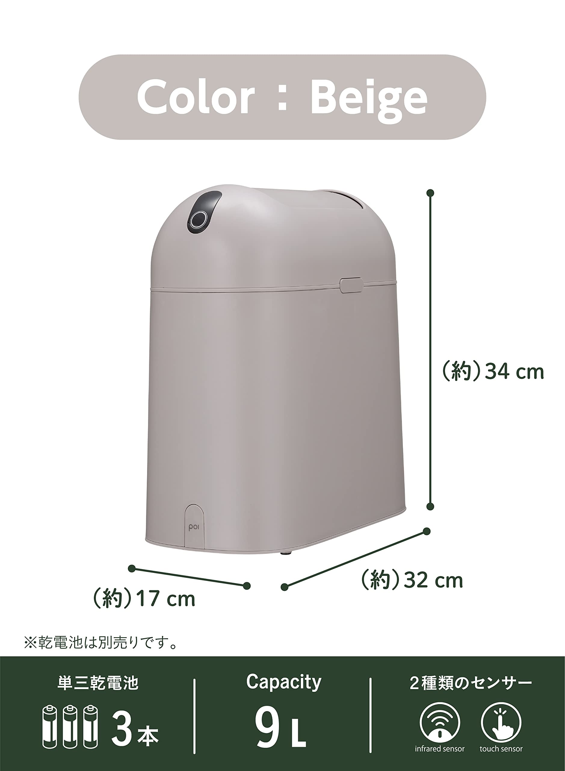 §cb\CB JAPAN CO.,LTD. シービージャパン ゴミ箱 自動 [スライド開閉/2モード搭載/乾電池式] 容量9L ベージュ 自動で開くゴミ箱 poi comtool。 ゴミ箱の中身が見えないから生活感が出にくく、フタが上に開かないから高さ制限を考えなくて良い「自動で開くゴミ箱poi」。 スタイリッシュなデザインで寝室やトイレ、キッチンやリビングなど置き場所を選ばずご使用いただけます。 容量9Lのコンパクトサイズなのも魅力。 自動開閉モード(赤外線センサー)と手動開閉モード(タッチセンサー)の便利な2モードを搭載しています。 直接ゴミ箱に触れなくていいから衛生的です。 自動開閉モード(赤外線センサー)・・・センサーパネルの上方20cm(±5cm)に手をかざすと自動で開閉します。 赤外線センサーの範囲内から外れると約5秒後に自動的にフラップが閉まります。 手動開閉モード(タッチセンサー)・・・センサーパネルに触れるとフラップが自動的に開きます。 再度センサーパネルに触れるまでは開いた状態で固定されます。 ※約5分間操作が行われない場合は自動的にフラップが閉まります。 S800-K9999