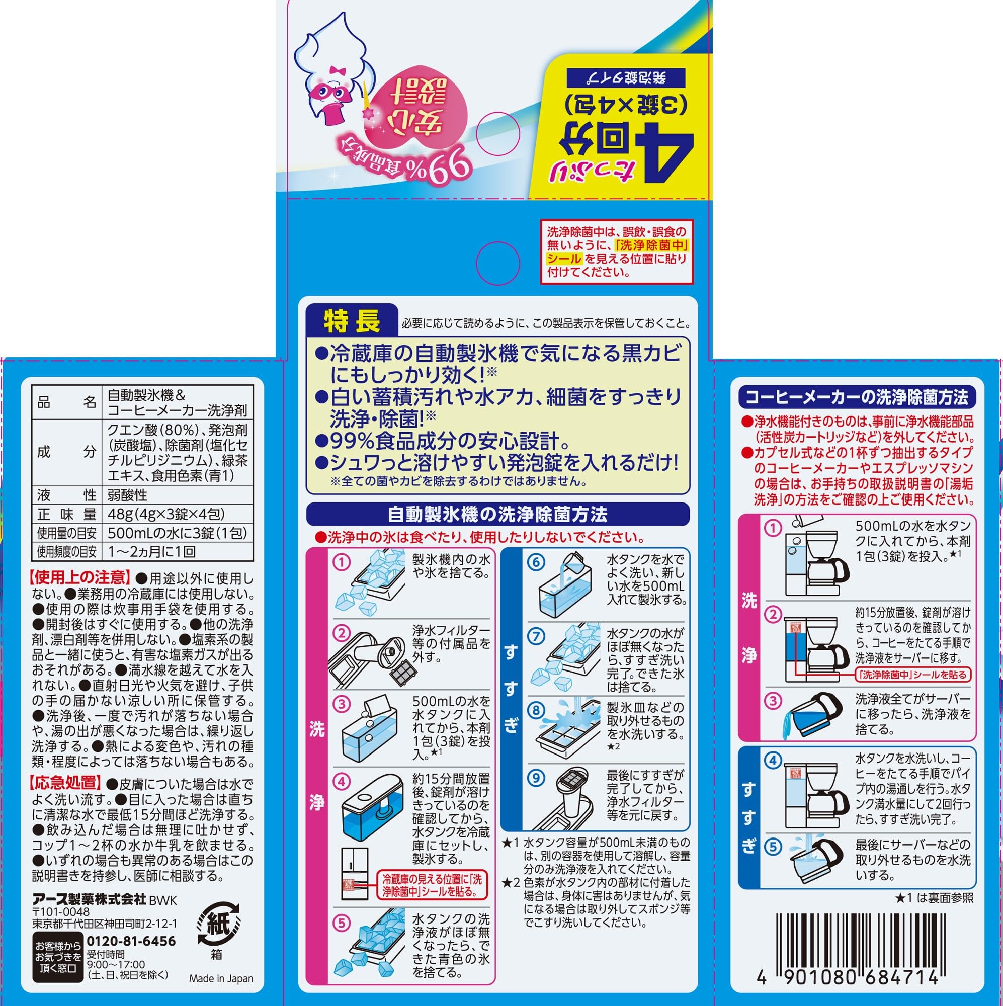 らくハピ コーヒーメーカー・自動製氷機の洗浄除菌剤 [3錠×4包入]。 商品紹介 コーヒーメーカーや自動製氷機の水だけでは落ちない、洗いにくいところの白い蓄積汚れ・水アカや細菌をすっきり洗浄・除菌冷蔵庫の自動製氷機で気になる黒カビにもしっかり効く(全ての菌やカビを除去するわけではありません)計量不要本品を1包入れるだけなので、使い方が簡単食品成分と歯みがき類に使用されている成分だけで作られているから安心塩素不使用溶けやすい発泡錠タイプ 使用上の注意 用途以外に使用しない。 業務用の冷蔵庫には使用しない。 使用の際は炊事用手袋を使用する。 開封後はすぐに使用する。 他の洗浄剤、漂白剤等を併用しない。 塩素系の製品と一緒に使うと、有害な塩素ガスが出るおそれがある。 満水線を越えて水を入れない。 直射日光や火気を避け、子供の手の届かない涼しい所に保管する。 洗浄後、一度で汚れが落ちない場合や、湯の出が悪くなった場合は、繰り返し洗浄する。 熱による変色や、汚れの種類・程度によっては落ちない場合もある。 商品サイズ (幅×奥行×高さ) :81mm×55mm×151mm。 原産国:日本。 内容量:3錠×4包入。 S000-K9999