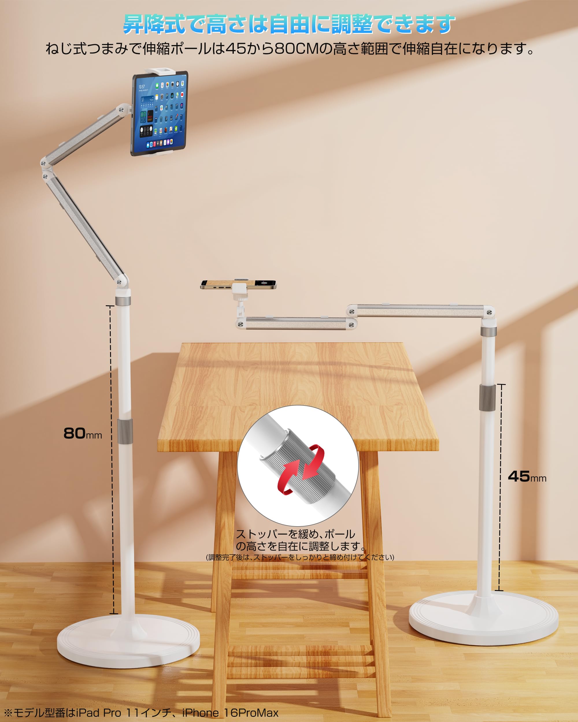 KUUVAN タブレットスタンド アーム 床置き スマホ俯瞰撮影スタンド 伸縮式 寝ながら 4.7-17.3インチ対応 55-135CM高さ調整 耐荷重1.8KG 可動域広 360度回転 3KG土台強化 スマホ/タブレット対応(ホワイト) 10/08更新 | karuamiruku