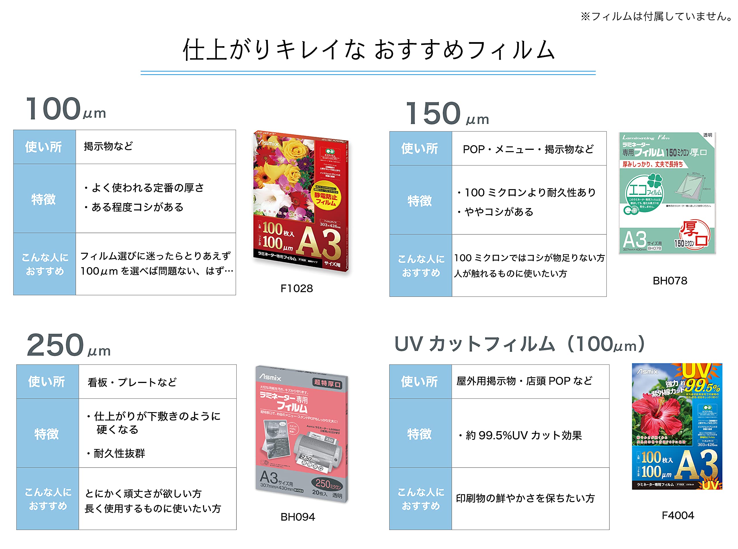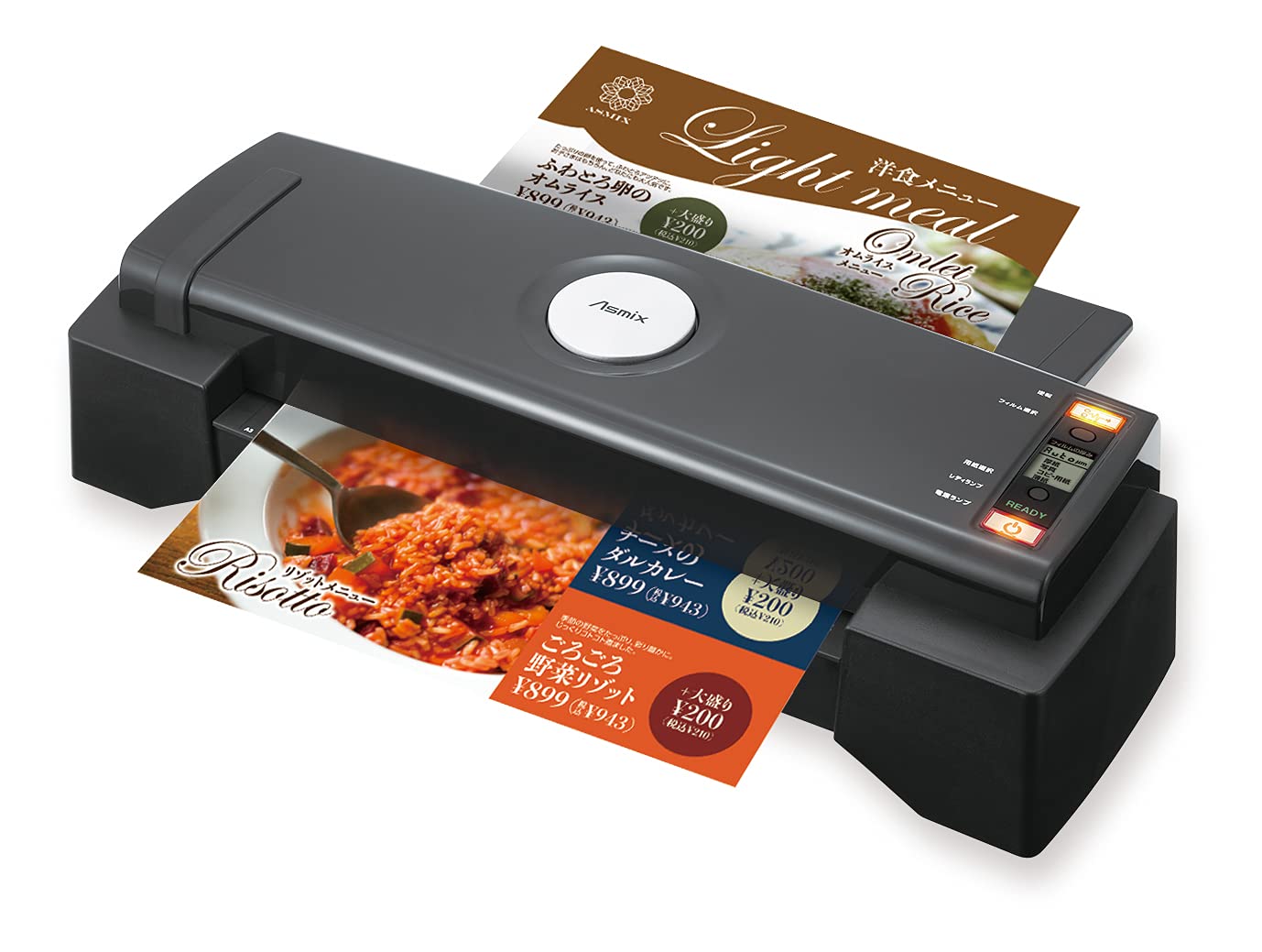 アスカ ラミネーター 6本ローラー L620A3 最速9秒 フルオート 自動厚み検知 250ミクロンまで。 6本ローラーラミネーター(ヒーターローラー4本、プレスローラー2本)で高速化を実現。 最速A4サイズ約9秒で仕上げます(設定・周囲の温度により異なる)。 操作が簡単なフルオートラミネーター。 オート設定にすれば厚みを検知して自動でスピード・温度調整してくれます。 マニュアル設定も可。 入り口と出口にセンサーがついていて、詰まりを検知したら自動で逆回転(オートリバース機構)。 75~250μmフィルムに対応。 ウォームアップ時間60秒、最大ラミネート厚1.0mm、最大ラミネート幅307mm。 外形寸法W522×D363×H128mm、質量約4.3kg。 S000-K9999