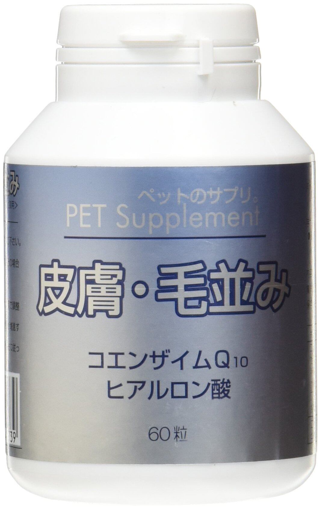 ペットのサプリ。 皮膚・毛並み。 商品紹介 ヒアルロン酸の持つ高い保水力で皮膚の潤いを保ち、毛並みの輝きをサポートします。 コエンザイムQ10入り。 使用上の注意 本商品は、ペット用です。 使用用途以外には、使用しないで下さい。 お子様の手の届かない場所に保管して下さい。 原材料・成分 乳糖、ビール酵母、コラーゲン、コエンザイムQ10、ヒアルロン酸、チキンエキス、ナタネ油脂粉末、グリセリン脂肪酸エステル 使用方法 食事といっしょに与えて下さい。 目安 ・体重=~5kg→1日の給与量=1粒 ・体重=5~10kg→1日の給与量=2粒 ・体重=10~15kg→1日の給与量=3粒・体重= 15kg~→1日の給与量=4粒 ご注意(免責)>必ずお読みください 生後4ヶ月未満の幼犬猫には与えないで下さい。 本商品は、多量摂取により疾患が治癒したり、より健康が増進するものではありません。 本体重量 :38g。 原産国:日本。 栄養成分:(60粒16.2g当たり) ・エネルギー61.2kal ・たんぱく質3.0g ・脂肪0.2g ・炭水化物12.0g ・灰分0.3g ・食塩0.03g <コエンザイムQ1016.2μg><ヒアルロン酸16.2mg>。 S000-K9999