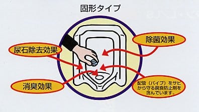 四国化成工業株式会社 尿石除去剤 トレピカワンT-25A(3パック 計12錠)。 商品の説明 小便器の目皿(水の流れていくところ)に、1~2錠置いてください。 使用状況により異なりますが、1~3ヶ月間効果が持続します。 (カセットの中の白い錠剤が無くなったら終わりです。 ) 最初の尿石の付着状況によりますが、1~3ヶ月くらいできれいになります。 水を流せる小便器は、使用後必ず水を流す習慣を!! 水を流さず、配管やトラップ内が,“おしっこ”だけになっていると、尿石付着や悪臭を抑えきれない場合があります。 (トレピカワンの溶ける量が少なすぎてしまうため。 ) 配管が詰まり気味で流れが悪くなっているような場合や、男子トイレからの“尿石臭”でお困りの場合は,「サニ・スカッシュ」や「デオライトSP」などで、あらかじめ尿石を取り除いたほうが、状況を早く改善することができますのでオススメします。 使用方法 小便器の目皿(水の流れていくところ)に、1~2錠置いてください。 使用状況により異なりますが、1~3ヶ月間効果が持続します。 (カセットの中の白い錠剤が無くなったら終わりです。 ) 最初の尿石の付着状況によりますが、1~3ヶ月くらいできれいになります。 水を流せる小便器は、使用後必ず水を流す習慣を!! 水を流さず、配管やトラップ内が,“おしっこ”だけになっていると、尿石付着や悪臭を抑えきれない場合があります。 (トレピカワンの溶ける量が少なすぎてしまうため。 ) 配管が詰まり気味で流れが悪くなっているような場合や、男子トイレからの“尿石臭”でお困りの場合は,「サニ・スカッシュ」や「デオライトSP」などで、あらかじめ尿石を取り除いたほうが、状況を早く改善することができますのでオススメします。 安全警告 -取扱上の注意- ・幼児の手の届所には置かないで下さい。 ・食べ物ではありません。 ・尿石除去以外の用途には使用しないで下さい。 ・本剤に直接、酸性、アルカリ性の洗浄剤をかけないで下さい。 分解ガスが発生し、危険です。 ・使用中に目にしみたり、気分が悪くなったときは使用を中止し、新鮮な空気の場所に移動し、洗眼して下さい。 ・本剤が直接、皮膚や衣類、カーペットに付着した場合は払い落とすか水洗いして下さい。 ・本剤が金属類に付着した場合は水で洗い流して下さい。 錆びることがあります。 ・万一、クリに入った場合は牛乳や水を飲み、目に入った時は流水で洗い、速やかに医師の手当てを受けて下さい。 ・できるだけ乾燥した涼しい所に保管してください。 男子便器の目皿の上に、そっと置くだけ。 簡単にセットできます。 トイレを使用するたびに、付着している尿石を取り除いていきます。 もちろん尿石の出来にくい環境にする事で、尿石付着を防止します。 除菌作用があるため、見えない配管部分も、清潔に保ちます。 悪臭成分を分解除去しますので、男子トイレ独特のイヤな臭いが残りません。 金属腐食防止剤が配合されていますので、腐食性はほとんどありません。 S350-K9999