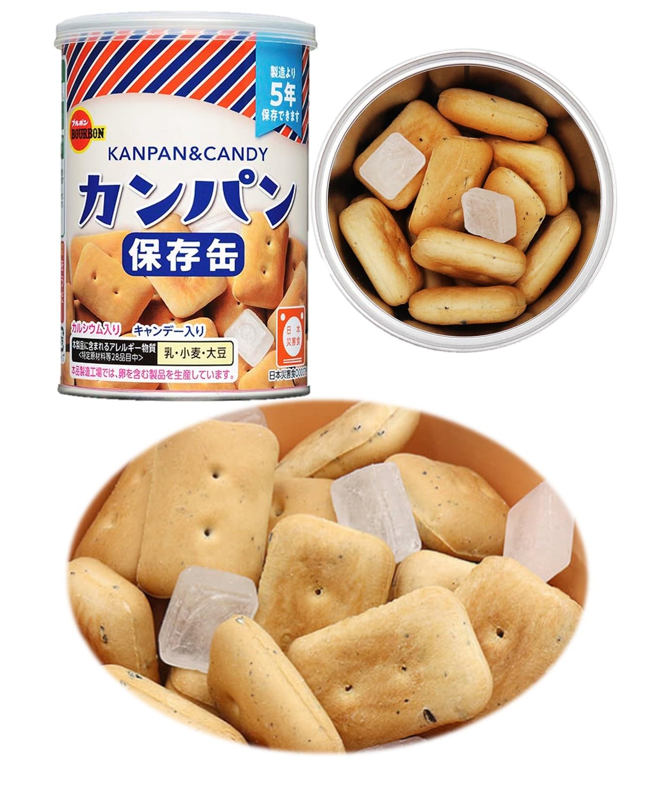 備蓄用 非常食 ブルボン カンパン (3缶セット)。 非常食として備えておきたい備蓄保存用のブルボンカンパン。 製造日から5年保存。 【内容量】100g。 【原材料名】<カンパン>小麦粉、砂糖、ショートニング、ぶどう糖、ごま、食塩、乳糖、イースト、炭酸カルシウム<キャンデー>砂糖、水飴【栄養成分表示】<カンパン>エネルギー:369kcal、たんぱく質:10.1g、脂質:4.3g、炭水化物:72.5g、ナトリウム:189mg、カルシウム:329mg<キャンデー>エネルギー:39kcal、タンパク質:0g、脂質:0g、炭水化物:9.8g、ナトリウム:0mg、カルシウム:0mg。 S000-K9999