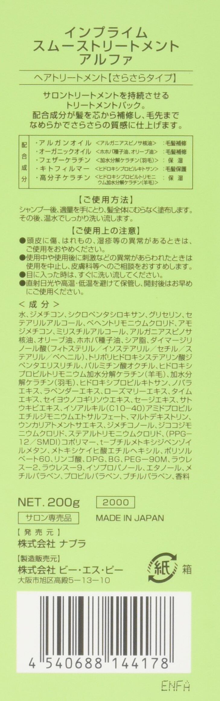 【X3個セット】 ナプラ インプライム トリートメント アルファ (スムース:さらさら) 200g。 保湿・補修効果に優れたアルガンオイル配合 「コスト・時間・持続性」追及の3浴式トリートメントシステム 「コスト・時間・持続性」向上をテーマに開発したサロン&ホームケアトリートメントシステムです。 枝毛・切れ毛・毛先のダメージケアに着目し、保湿・補修効果に優れたアルガンオイルを共通配合。 思わず触れたくなるような、うるおいに満ちたしなやかな髪へと導きます。 ナプラ インプライム トリートメント インプライムのトリートメントシステムを利用した後日、お家で行うケア。 時間が経ち、失われてきたサロントリートメントの質感を向上させるサプリメントパック。 髪を芯から補修して、なめらかな手触り感を与えます。 【アルファ (スムース、さらさら) 】 【ベータ (モイスチャー、しっとり) 】。 S350-K9999