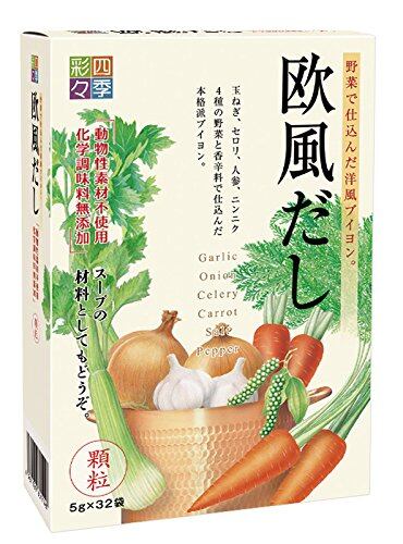 スカイ・フード 四季彩々欧風だし 5g×32P×2箱。 内容量:5g×32P×2箱。 原材料:塩、澱粉分解物、酵母エキス、ローストオニオン、醤油、コショー、セロリ、キャロット、ガーリック、澱粉。 商品サイズ(高さx奥行x幅):190mmx90mmx260mm。 S350-K9999