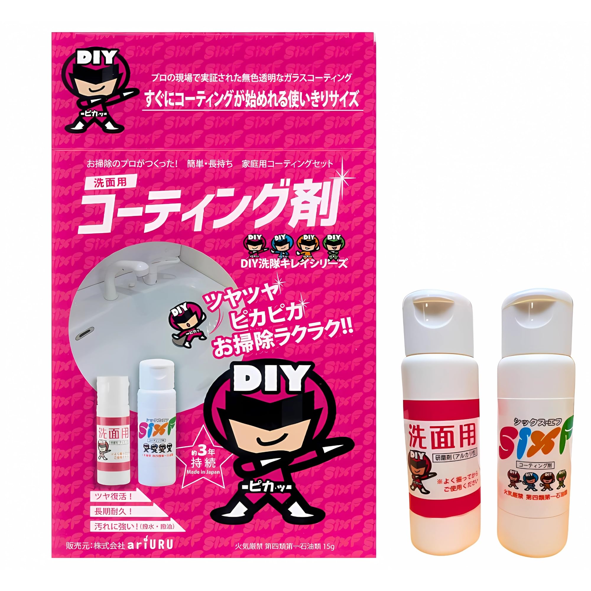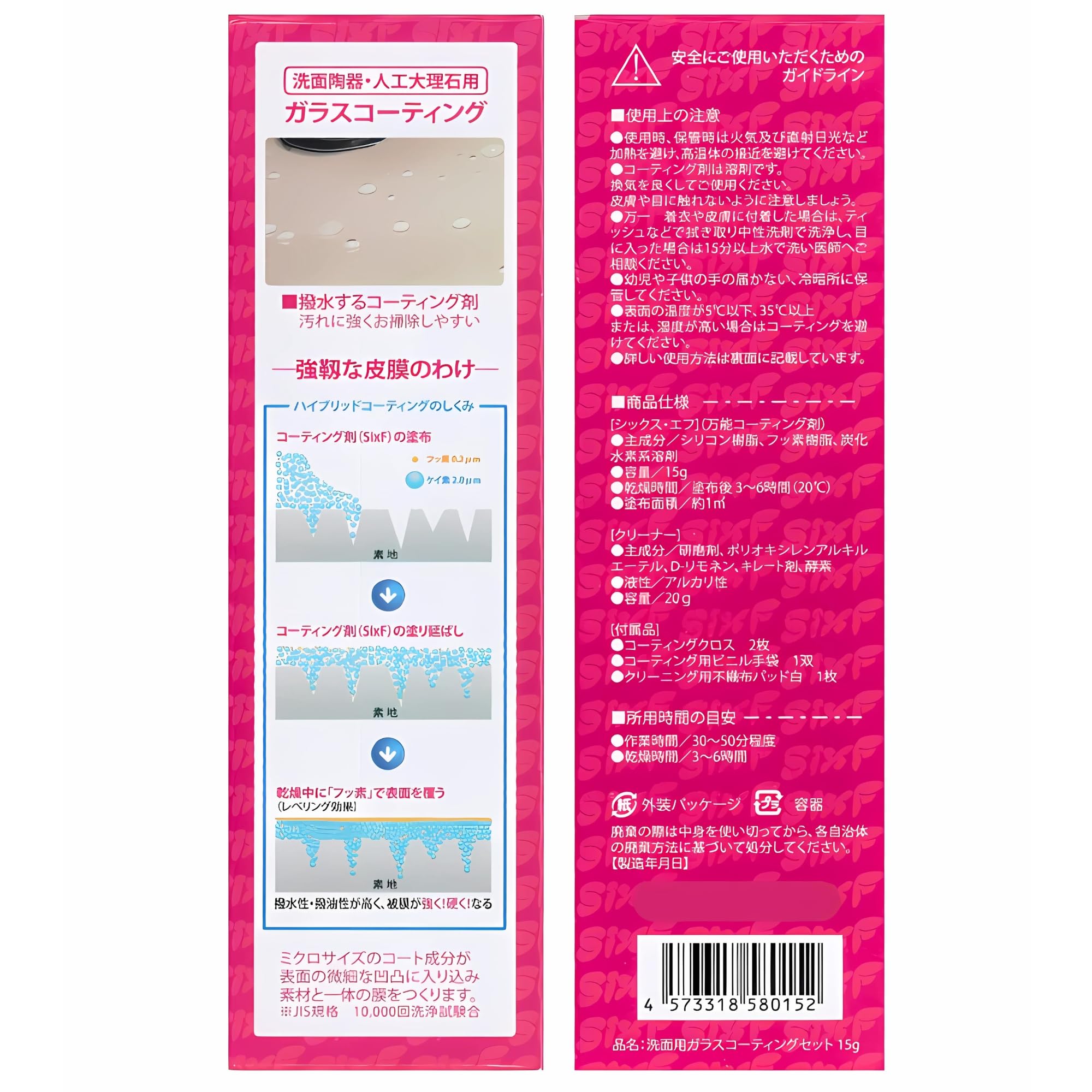 戦隊シリーズ 洗面キレイ 洗面陶器・人工大理石用 ガラスコーティング(プロ仕様)のセット。 お掃除のプロがつくった!簡単ラクラク・約3年長持ち 洗面台の家庭用コーティングセット!撥水・撥油性効果アップでキレイ効果が変わります! 汚れを弾く強力な超薄膜!フッ素 とケイ素のハイブリッド樹脂成分が深く浸透します。 油や炭酸、アルカリ、アルコール、各種溶剤などを寄せ付けないので綺麗な状態に保つことができます。 独自に開発したハイブリッド系コーティング剤 「シックス・エフ(SixF)」 は従来のワックスやコーティング剤が抱えていた様々な問題点をクリアした画期的な保護メンテナンス工法です。 【洗面・人工大理石・浴槽など用】汎用研磨剤ガラスコーティング シックス・エフ 特徴/ミクロのコーティング成分( フッ素 ・ ケイ素 )が凹凸に入り込み素材に強力な膜を作ります。 【商品内容】・コーティング剤( SixF ) 15g ・クリーナー 20g ・磨き用不織布(白パッド)1枚 ・使い捨てケミカルクロス 550mm×360mm 2枚 ・ビニール手袋 1組 用途/ 人工大理石 、 陶器 、 浴槽 、FRP 、 電話機 、 OA機器 、 ヘッドライト 、 ヘルメット 、 ショーケース 等の磨きツヤ出し。 S000-K1010