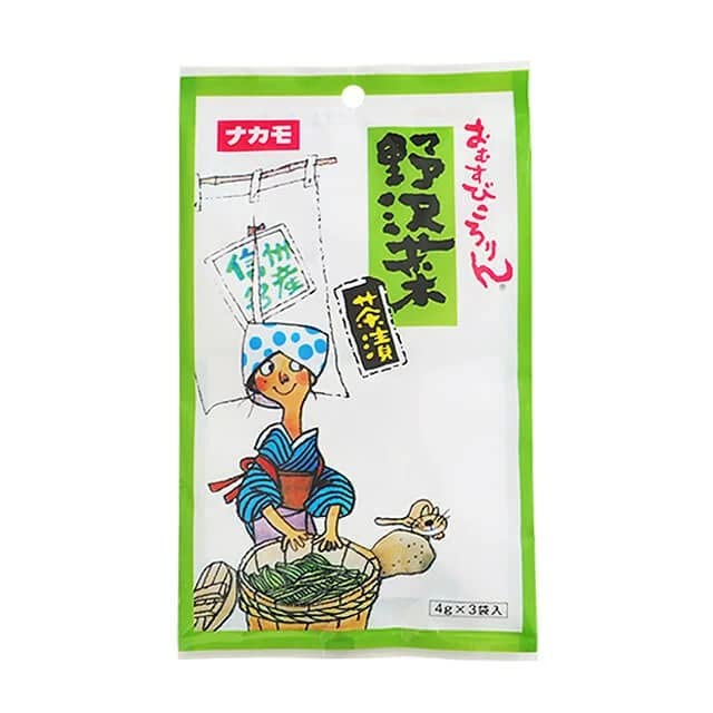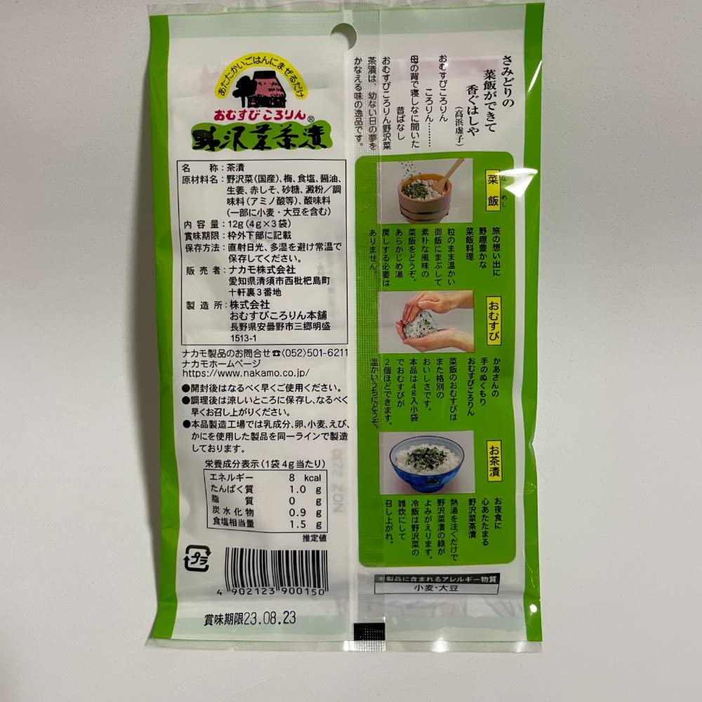 ナカモ おむすびころりん 野沢菜茶漬 4g×3袋×8パック。 商品の説明 昔懐かしい野沢菜のお茶漬けです。 ふりかけにしたり、混ぜたり、ご飯がすぐに美味しくなります。 【料理例】お茶漬け、おにぎり、菜飯、など。 原材料・成分 野沢菜(国産)、梅、食塩、醤油、生姜、赤しそ、砂糖、澱粉/調味料(アミノ酸等)、酸味料(原材料の一部に小麦を含む)。 昔懐かしい野沢菜のお茶漬けです。 ふりかけにしたり、混ぜたり、ご飯がすぐに美味しくなります。 原材料:野沢菜(国産)、梅、食塩、醤油、生姜、赤しそ、砂糖、澱粉/調味料(アミノ酸等)、酸味料(原材料の一部に小麦を含む)。 賞味期限:製造日より365日。 保存方法:直射日光、多湿を避け常温で保存してください。 S000-K1010
