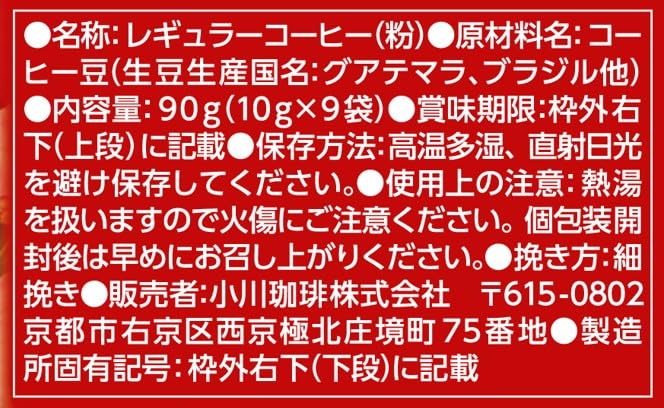 小川珈琲 期間限定 冬珈琲 ドリップコーヒー 9杯分 ×3個。 商品紹介 <味わい> グアテマラSHBの芳醇な香りとなめらかな口あたりを活かして、しっかりとした風味に仕上げました。 コーヒー豆(生豆生産国名:グアテマラ、ブラジル他) 原材料・成分 コーヒー豆。 ドリップコーヒー。 S000-K1010