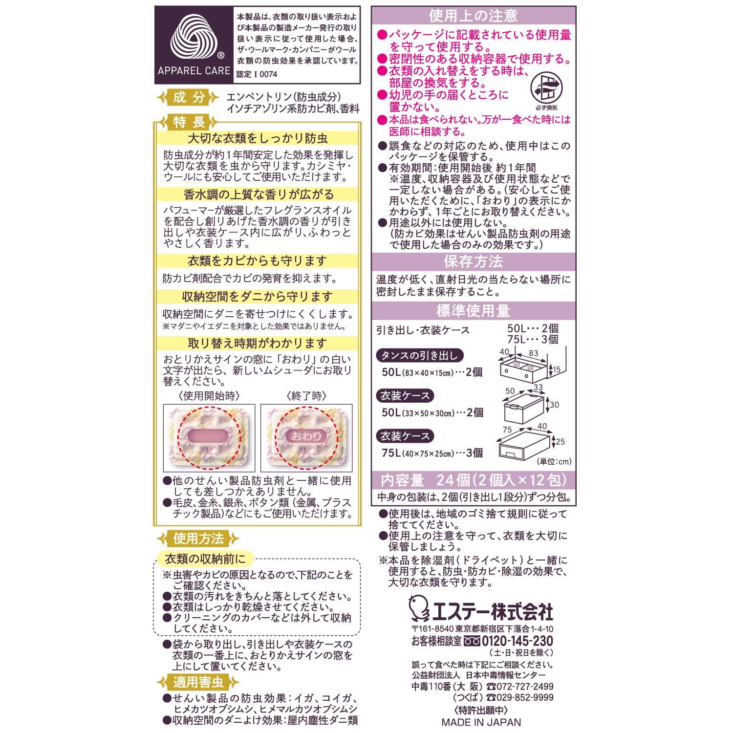 ムシューダ プレミアムアロマ [まとめ買い] 衣類用 防虫剤 香り付き 防カビ剤配合 引き出し 衣装ケース用 グレイスボーテ 24個入×2個 1年間有効 衣類 防虫。 商品紹介 大切な衣類を約1年間しっかり虫から守ります。 パフューマ―が厳選したフレグランスオイルを配合した香水調の香りが、収納空間内にふわっとやさしく広がります。 取り替え時期がわかる、おとりかえサインつきです。 原材料・成分 エンペントリン(防虫成分)、香料 安全警告 パッケージに記載されている使用量を守って使用する。 密閉性のある収納容器で使用する。 衣類の入れ替えをする時は、部屋の換気をする。 幼児の手の届くところに置かない。 本品は食べられない。 万一食べた時には医師に相談する。 有効期間:使用開始後 約1年間※温度、収納容器及び使用状態などで一定しない場合がある。 (安心してご使用いただくために、「おわり」の表示にかかわらず、1年ごとにお取り替えください。 ) 使用後は、地域のゴミ捨て規則に従って捨てる。 用途以外には使用しない。 【フレグランスオイル配合】パヒューマーが厳選した香水調の香りが、収納空間内にふわっとやさしく広がります。 【1年間有効】大切な衣類を約1年間しっかり虫から守ります。 おとりかえサインつき。 【防カビ剤配合】カビの発育を抑え、衣類を カビ からも守ります。 【用途】せんい製品防虫剤 引き出し 衣装ケース用。 【香り】グレイス ボーテ。 S000-K9999