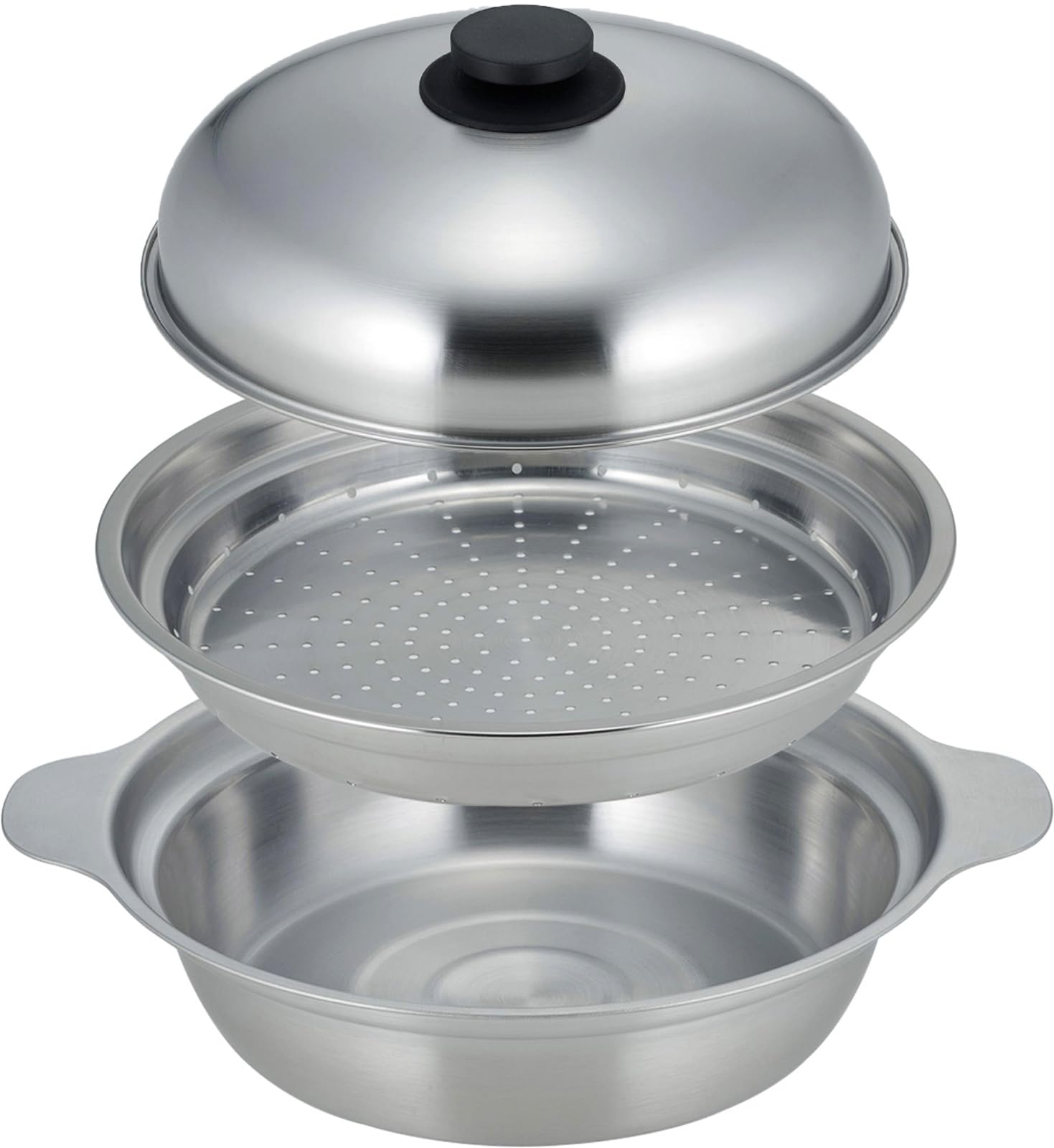 下村企販 卓上鍋 24cm 蒸し皿付き 【日本製】 IH・ガス火対応 継ぎ目がなくお手入れ簡単 割れにくい 蒸し器にもなる 豚まん 野菜 なべ 両手鍋 ステンレス 燕三条 44763。 軽くて割れない、扱いやすいステンレス製の卓上鍋 蒸し皿付きで、野菜を蒸してしゃぶしゃぶや、焼売・小籠包などもテーブル上で作れる ガス火はもちろんIH調理器にも対応 本体と蒸し皿は持ち手までステンレス1枚板で成形した継ぎ目がない仕様で、汚れも付きにくくお手入れ簡単 蒸し皿は26cmのフライパン上にのせて使用することもできる。 サイズ(約):幅34×奥行28.5×高さ14cm、内径23.5×深さ5cm(段まで)、内径26.2×深さ6.7cm(フチ部まで)、蒸し皿/外径28×高さ4.3cm(内径23.5×深さ4.2cm)。 本体重量(約):1.06kg。 素材・材質:本体/ステンレス鋼(クロム18%、底厚1mm)、蒸し皿/ステンレス鋼(クロム18%)、フタ/ステンレス鋼(クロム18%)、ツマミ/フェノール樹脂、ツマミベース/66ナイロン。 生産国:日本。 対応熱源:ガス火・IH対応、容量(約)/3.0L。 S000-K1010