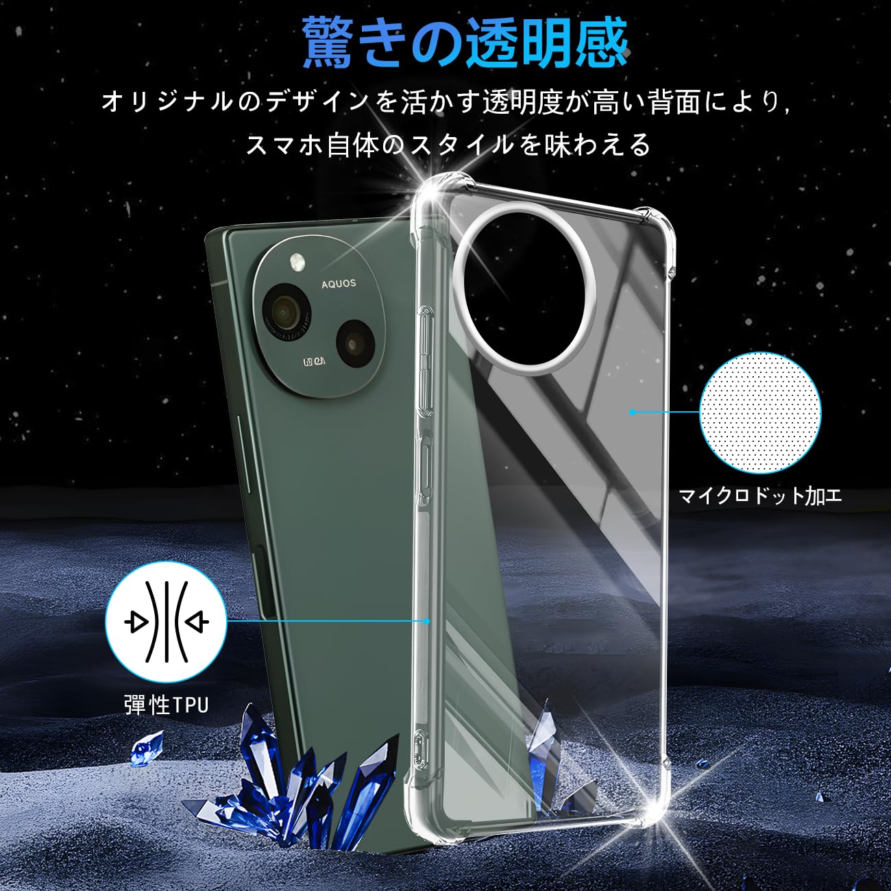 対応 AQUOS R9 ケース AQUOSR9 クリア ケース あんしんファミリースマホ カバー TPU 保護ケース AQUOS R9 カバー背面 シェル クバー ソフト 透明シェル ンプロテクター SENXLL-R9T1。 【360°フルガード 軍用グレード、高い耐衝撃性】 本製品はに対応する透明ケースです。 外側のシェルは高い耐黄い耐性を備えた最先端技術ADMを採用しております。 しかも環境にやさしく、無毒で無味の高品質の素材を使用して、酸化防止処理しており、長年でも黄色くなりません。 多数回のテストした後、2mの高さで様々な角度から26回落としましたが、携帯電話が全然傷がありませんでした!更に四隅の耐衝撃性は通常の携帯電話ケースの5倍に達し、携帯電話を全面的に保護できます。 (ご注意:ご購入前機種をよくご確認くださいね。 間違った機種の購入による使えないことを避けてください)。 【細かいところまで保護できる安心設計・レンズと液晶画面にも保護】携帯電話を平らな面に置いたとき、液晶画面とカメラレンズの接触による不具合を最小限に抑えるため、カメラレンズより0.5mmをアップし、液晶画面より0.8mmアップしております。 スクリーンを保護する同時に、ガラスフィルムをまったく邪魔しません。 更に滑り止めと落下防止の設計があり、テーブルから滑り落ちる心配はありません。 裏面は放熱性に優れたポリカーボネート素材を採用し、効率的に放熱し、バッテリーを完璧に保護することができます。 携帯電話ケースを付けたままでもワイヤレス充電が可能です。 【優れた精度】あんしんファミリースマホ ケース 薄くて頑丈で、程よいグリップ感があり、できるだけスマートフォン本体のスリムさを極力損なわないように設計した透明背面ケースです。 位置、及び全てのスピーカー、ポート、ボタンを精密に設計しており、充電、及びヘッドフォンで音楽を聴いても機能的な使用を妨げなく、携帯電話に負荷をかけなく、簡単に取り付けることができます。 【完全透明・上質な透明感】 超精密な光透過分子を備えて、後ろの光透過率は 99% に達します。 後ろのポリカーボネートの耐用性と耐摩耗性が抜群です。 本来の美しさや高級感を影響しなく、シルクと全く同じ風合いで、涼しい触る感じがあります。 誰にでも適用し、夢中になってしまって触りたくなります。 【傷も指紋も防止・フィット感も満点】 いつも指紋や油汚れに悩んでいますか。 携帯保護ケースをお選びください。 高精度の表面処理を採用して、しかも携帯電話ケース全体にも防汚バイオテクノロジーを採用しており、指紋や汚れがついても、水洗いして布で軽く拭くとピカピカになります。 スマホケースのエッジ部分はダイヤカット処理を使って、より洗練で美しい見た目があります。 S000-K9999