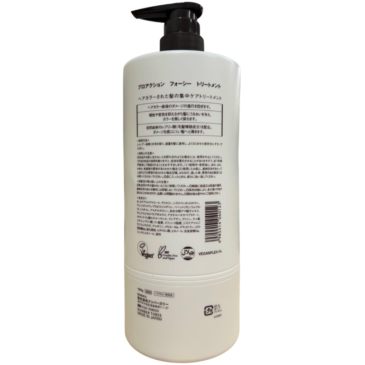 ナンバースリー プロアクション フォーシー トリートメント 1000g(ポンプ)。 商品紹介 ヘアカラーされた髪の集中ケアトリートメントです。 ヘアカラー直後のダメージの進行を防ぎ、髪のpHバランスを整えます。 また、色素定着を行い、褪色や変色を抑え、髪に潤いを与えカラーを美しく保ちます。 お問い合わせ先 株式会社ナンバースリー TEL:0120-768003 使用方法 シャンプー後、軽く水気を取り適量を髪によくなじませた後、よくすすいでください。 ご注意 ・頭皮に傷、はれもの、湿疹等、異常のある時はお使いにならないでください。 ・使用中や使用後に、刺激等の異常が現れた時はお使いにならないでください。 ・目に入った時は、直ちに洗い流してください。 ・極端に高温又は低温となる場所、直射日光のあたる場所には保管しないでください。 原材料・成分 水・セテアリルアルコール・グリセリン・シクロメチコン・アモジメチコン・ベヘントリモニウムクロリド・エタオール・ジメチコン・ジステアリジモニウムクロリド・クレアチン・カチオン化加水分解コムギタンパク-3・リン脂質・スフィゴ脂質・カタラーゼ・ベタイン・PCA・PCA-Na・アルギニン・塩化Na・メトキシケイヒ酸オクチル・メチルパラベン・プロピルパラベン・香料 使用方法 シャンプー後、軽く水気を取り適量を髪によくなじませた後、よくすすいでください。 安全警告 使用中、または使用した肌に直射日光があたって、赤み、はれ、かゆみ、かぶれ、刺激、色抜け(白斑等)や黒ずみ等の異常が現れた場合は使用を中止し、皮膚科専門医等にご相談ください。 そのまま使用を続けますと、症状を悪化させることがあります。 傷、はれもの、湿疹、皮膚炎(かぶれ、ただれ)等の皮膚障害がある時は、悪化させるおそれがあるので使用しないでください。 目に入らないよう注意し、入った時は直ちに洗い流してください。 極端に低温または高温の場所、直射日光を避け、乳幼児の手の届かない場所に保管してください。 ご注意(免責)>必ずお読みください ※合わない場合は利用を中止し医師へ相談ください。 商品サイズ (幅×奥行×高さ) :8.5×8.5×25。 原産国:日本。 内容量:1000g。 S000-K9999