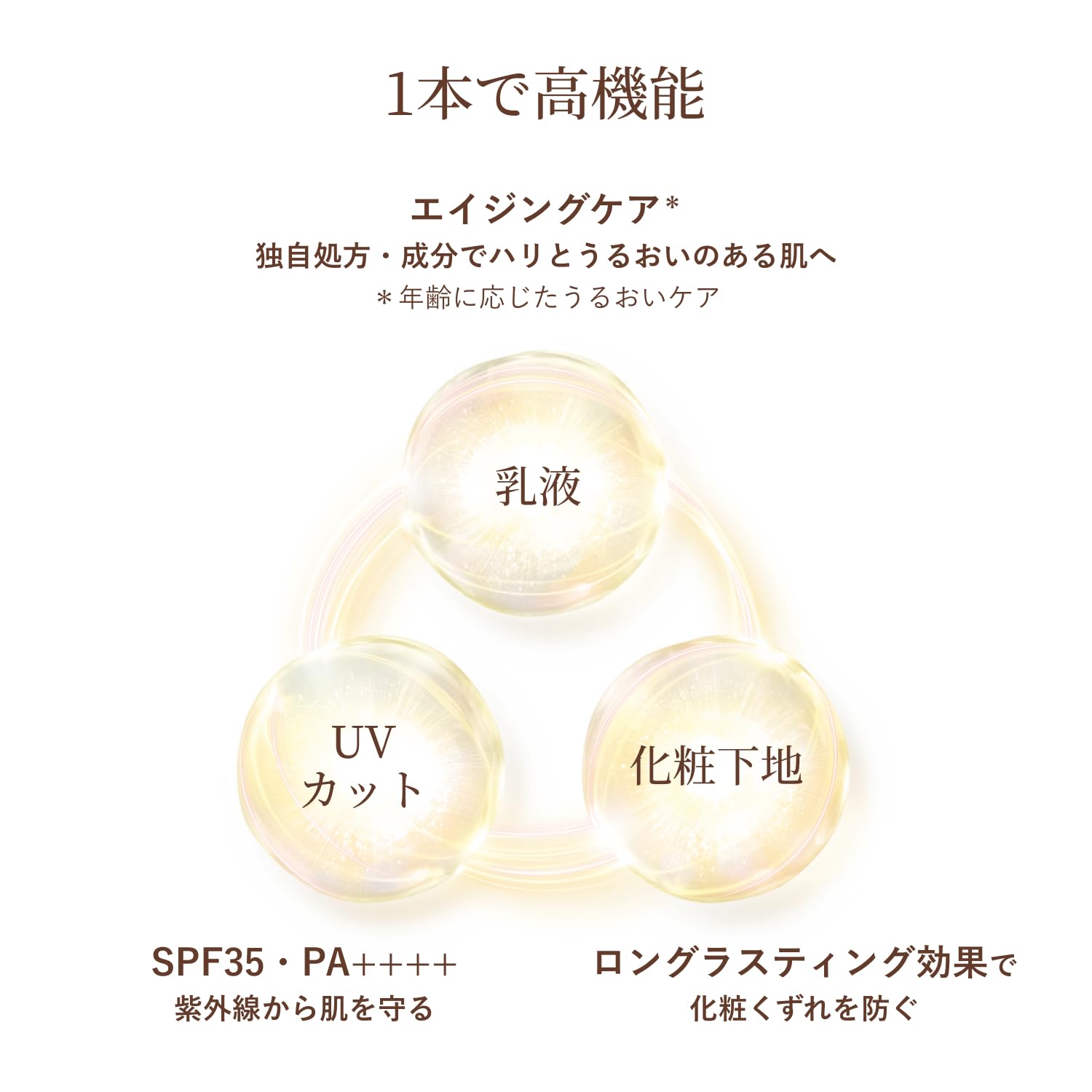 ELIXIR エリクシール デーケアレボリューション ba 35mL 【2025年モデル】 医薬部外品 UV乳液 朝用 日中用 日焼け止め ハリ うるおい SPF35 PA++++ エイジングケア シュペリエル 資生堂。 商品紹介 1本で高機能。 ふっくら柔らか美肌。 ハリとうるおい。 乳液・化粧下地・プロテクターの3つの効果が1本に。 使用方法 朝、化粧水の後、手のひらに1円硬貨大をとり、顔全体になじませます。 (朝のお手入れの最後に使用し、その後ファンデーションをご使用いただけます。 )使用量が少ないと、十分な紫外線防御効果が得られません。 内容量:35ml。 SPF35・PA++++。 医薬部外品。 S000-K9999