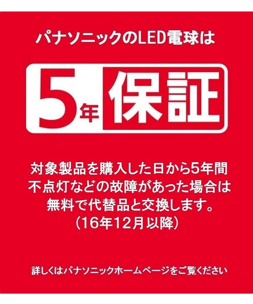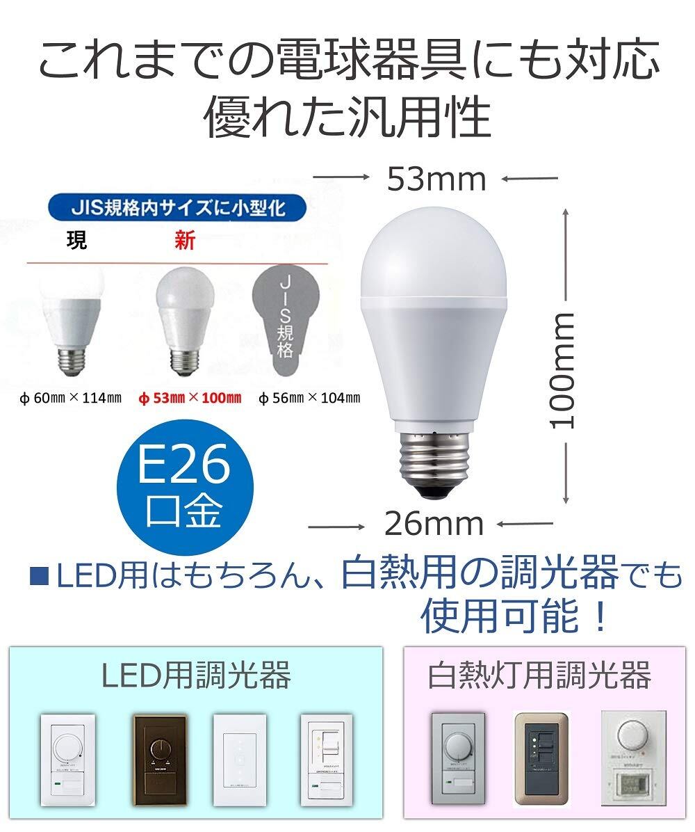 パナソニック LED電球 口金直径26mm 電球60形相当 電球色相当(7.3W) 一般電球 広配光タイプ 調光器対応 密閉器具対応 LDA7LGDSK6。 調光器対応のLED電球広配光タイプ(明るさ60形相当) 配光角約180度「広範囲を明るく照らす」 白熱灯用からLED用まで様々な調光器に対応 様々な器具に対応。 断熱材施工器具※1・密閉器具※1・屋外器具※2対応。 ※1 器具の種類によっては、保護回路が働き電力をおさえるため、明るさが低下する場合があります。 ※2 以下の条件を満たす場合、屋外器具での使用が可能です。 ・下面開放を除く防雨型、または防湿型の器具で使用すること。 (水滴・結露による故障の原因) ・ランプ周囲温度0℃~40℃の範囲で、点灯時に器具に直射日光があたらない場所で使用すること。 (水滴・結露による故障、温度過熱による短寿命の原因) ・屋内配線に接続された器具(宅内のブレーカーに接続された器具)で使用すること。 (雷などの高電圧による短寿命の原因) 光色:電球色相当 口金E26 屋外用器具への取り付け対応。 本体サイズ:外径 53mm長さ 100mm。 調光器対応のLED電球広配光タイプ(明るさ60形相当)。 光色:電球色相当。 口金E26。 定格寿命:40000時間。 密閉型器具への取り付け対応。 屋外用器具への取り付け対応。 明るさ:40。 定格電圧(V): 100、 定格消費電力(W):7.3。 色温度(K)2700、全光束(Lm)810。 S000-K9999