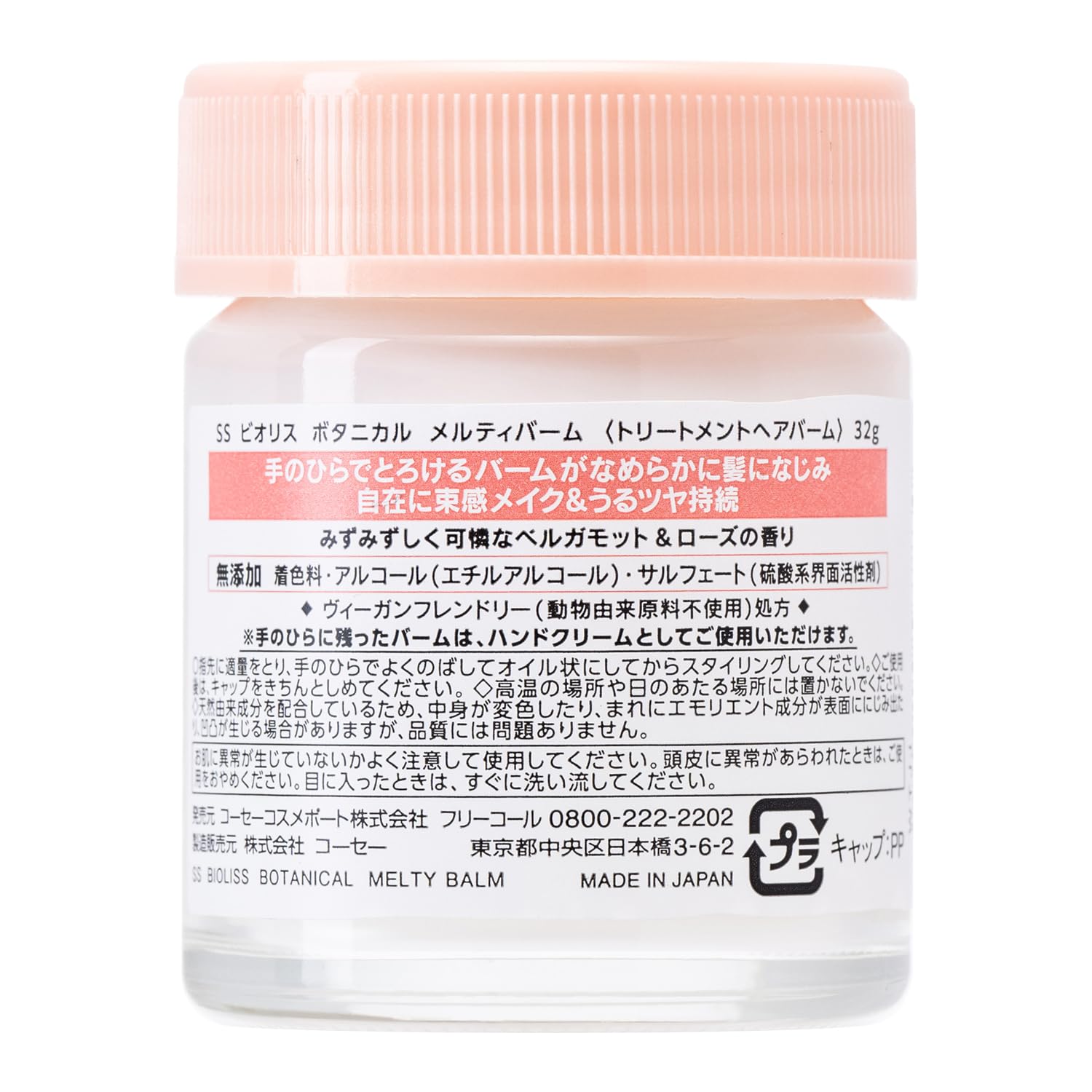 SALON STYLE(サロンスタイル) コーセーコスメポート KOSE ビオリス ボタニカル メルティ バーム 束感・つや ワックス ヘアバーム。 商品紹介 1本でトリートメント&スタイルメイクを叶える、濃密ボタニカルサジーcpx.配合のヘアバーム。 とろけるように髪になじんで、自在に束感メイク&うるツヤ持続。 みずみずしく可憐なベルガモット&ローズの香り。 原材料・成分 マカデミアナッツ油・エチルヘキサン酸セチル・テトラエチルヘキサン酸ペンタエリスリチル・合成ワックス・シア脂・ワセリン・マイクロクリスタリンワックス・パラフィン・イソステアリン酸・アーモンド油・アストロカリウムムルムル種子脂・アルガニアスピノサ核油・オリーブ果実油・カカオ脂・サフラワー油・トコフェロール・パルミチン酸アスコルビル・ヒポファエラムノイデス果実油・ホホバ種子油・BHT・オリーブ脂肪酸エチル・クエン酸・ジメチコン・トリ(カプリル酸/カプリン酸)グリセリル・ポリステアリン酸スクロース・メトキシケイヒ酸エチルヘキシル・メチルパラベン・香料 使用方法 指先に適量をとり、手のひらでよくのばしてオイル状にしてからスタイリングしてください。 ご使用後は、キャップをきちんとしめてください。 高温の場所や日のあたる場所には置かないでください。 天然由来成分を配合しているため、中身が変色したり、まれにエモリエント成分が表面ににじみ出たり、凹凸が生じる場合がありますが、品質には問題ありません。 安全警告 お肌に異常が生じていないかよく注意して使用してください。 頭皮に異常があらわれたときは、ご使用をおやめください。 目に入ったときは、すぐに洗い流してください。 1本でトリートメント&スタイルメイクを叶える、濃密ボタニカルサジーcpx.配合のヘアバーム。 とろけるように髪になじんで、自在に束感メイク&うるツヤ持続。 S000-K9999