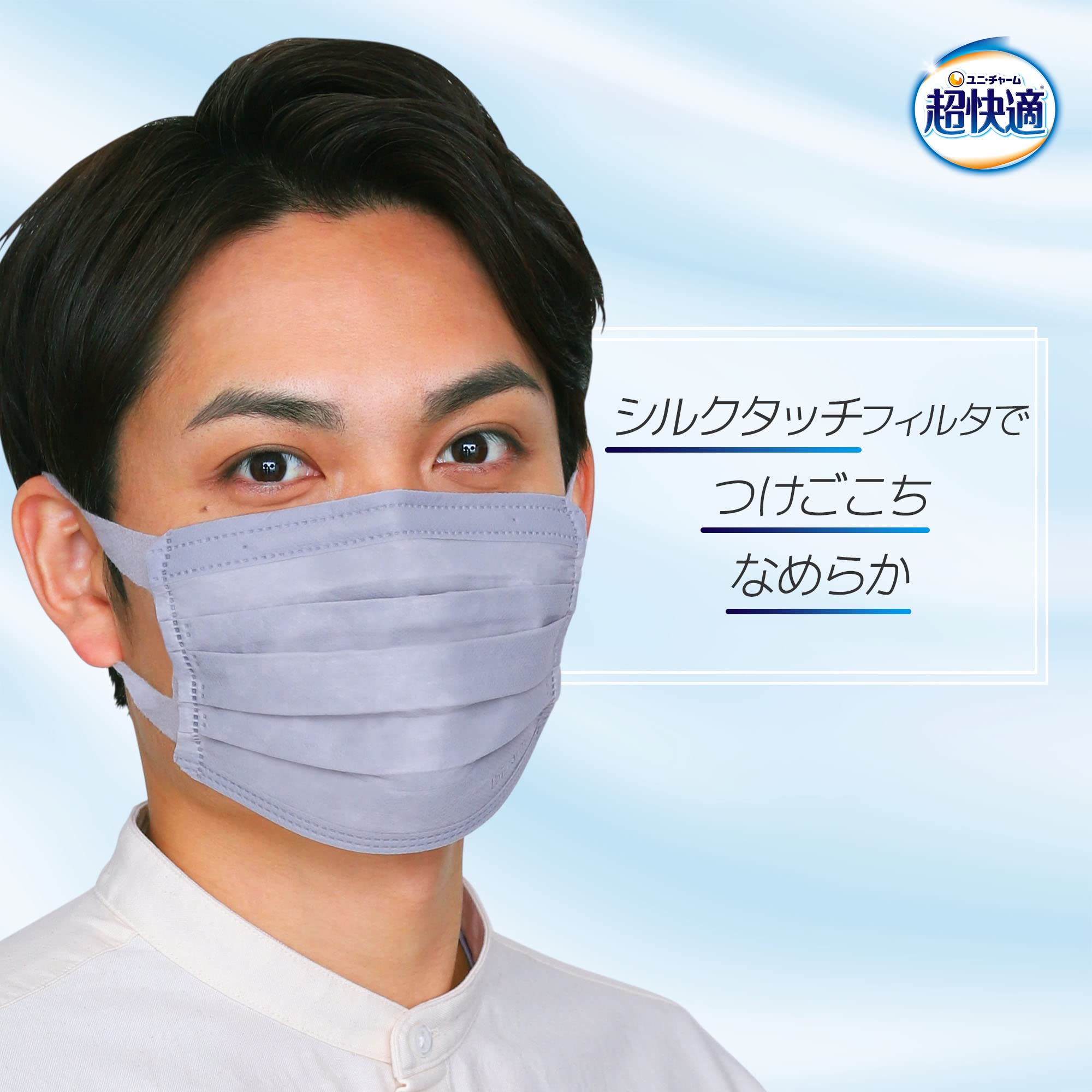 超快適マスク 風邪・花粉用 プリーツタイプ ライトグレー 不織布マスク 日本製 ふつうサイズ 30枚入 〔PM2.5対応 ノーズフィットつき〕(ウイルス飛沫カットフィルタ)〔JIS規格適合審査済み〕〔全国マスク工業会 会員マーク表示〕ユニチャーム。 やわらかストレッチ耳かけで、ず~っと、耳らくらく!長時間でも耳が痛くならない。 更に、本物シルク配合で、つけ心地なめらか!ウイルス飛沫カットフィルタ®で、空気中のウイルス飛沫・花粉の侵入をしっかりブロックします。 PM2.5にも安心。 不織布マスク。 S000-K9999