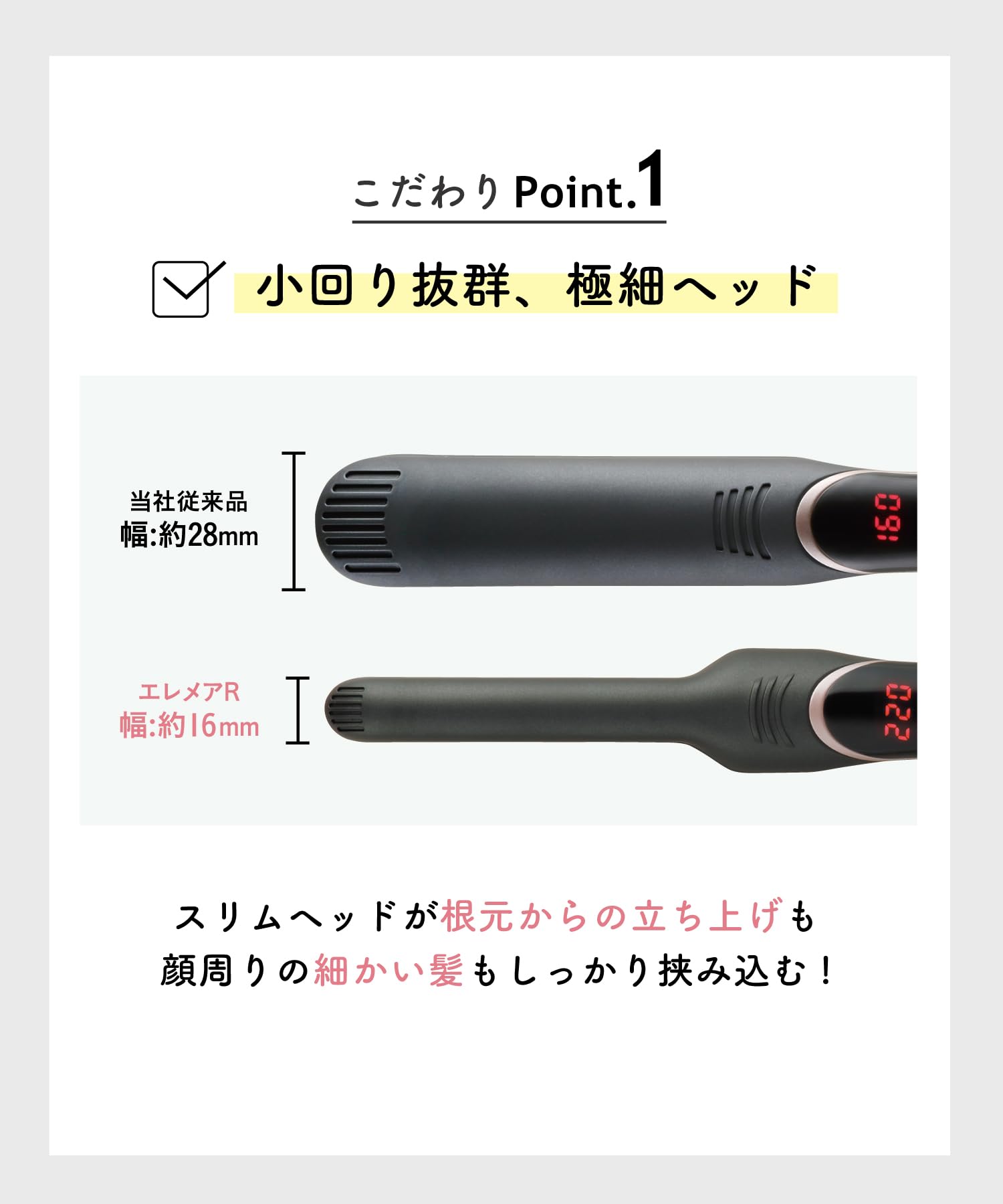 クレイツ エレメアR 指コテ 海外兼用 ショートヘアスタイル ニュアンスアレンジ レピ 前髪にも使える。 -。 高い操作性と小回りの利く特殊形状プレートで、多彩なアレンジを可能に。 プレートには、高濃度のクレイツイオン(プレミアムクレイツイ オン ※)を配合した「オーバルプレート」を採用。 半円形の特殊形 状プレートが髪をしっかり挟み込み、ナチュラルなストレートや Jカール、Cカールなどの多彩なカールアレンジを可能に。 また、 プレート幅1 2 m mのスリムプレートだから髪の根元や襟足など の細部のスタイリングも可能にします。 「プレミアムクレイツイオン」が失われた毛髪の水分バランスを整え、 潤いとツヤのある美しい髪へ導きます。 デジタル温度表示ディスプレイ 設定温度をデジタル表示するの で、温度確認が一目で分かりやすい 仕様です。 誤作動防止機能 アイロン使用時に温度調節スイッ チの誤作動を防止する設定が可 能です。 開閉ロック機能 開閉ロックスイッチで、使用後アイ ロンを閉じた状態で収納すること ができます。 S000-K9999