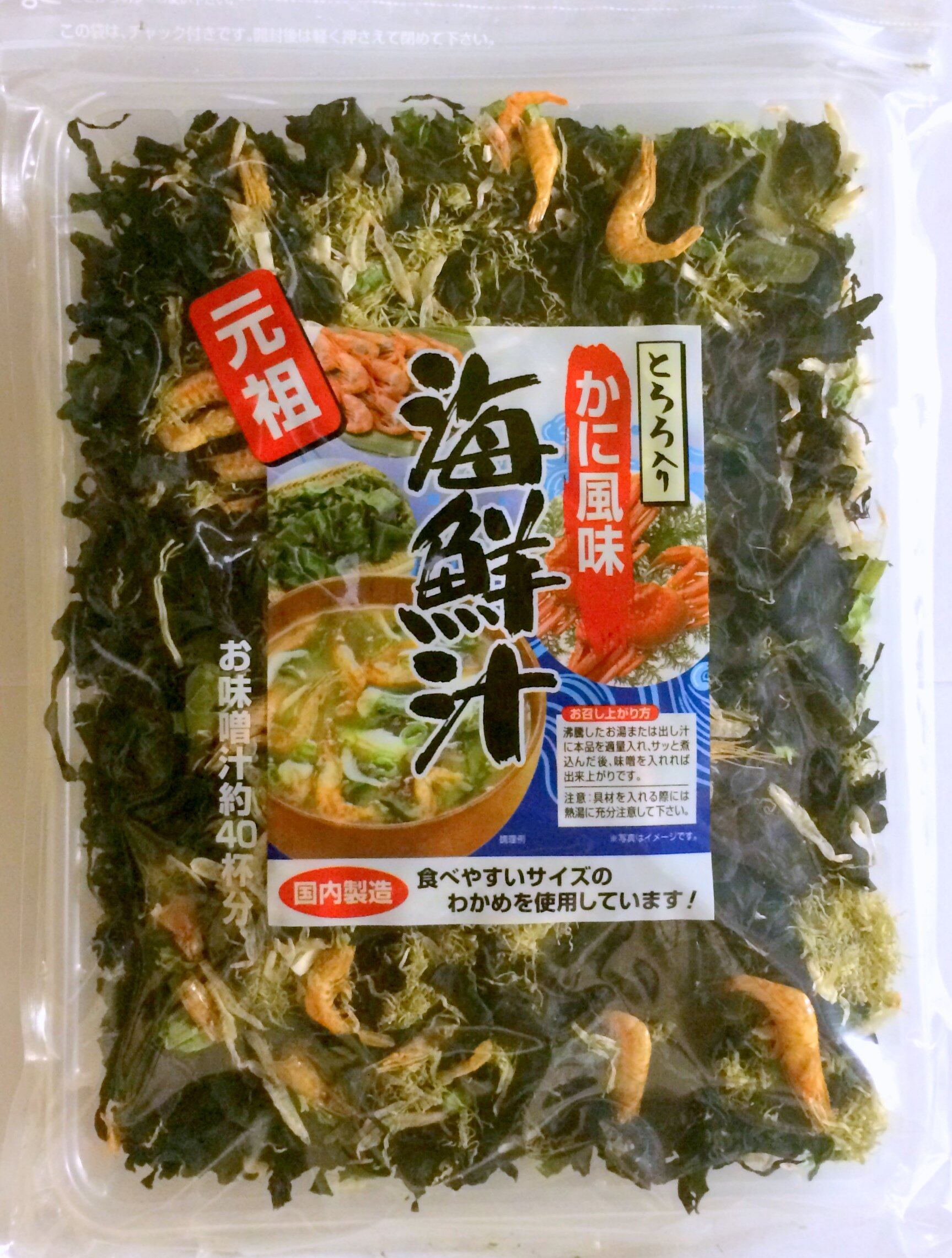 とろろ入り かに風味海鮮汁90g お味噌汁約40杯分。 沸騰したお湯または出し汁に入れるだけ!わかめがすぐに戻りますので、その後にお味噌を溶かしてお召し上がりください。 人気のわかめに加え、とろろや焼えびを トッピング。 本品が元祖海鮮汁です。 ロングセラー商品で人気が高い商品です。 ※内容量が120g→90gに変更になりました。 人気のわかめに加え、とろろや焼えびを トッピング。 本品が元祖海鮮汁です。 原材料名:乾燥わかめ(中国製造)、乾燥えび、乾燥ねぎ、乾燥あきあみ、とろろ昆布、乾燥杉のり、乾燥かに風味かまぼこ、調味料(アミノ酸等)、ソルビトール、膨張剤、ベニコウジ色素、加工デンプン、酸味料(一部にえび・かに・小・卵・大豆を含む)。 注意:本品製造工場では乳製品を含む製品を製造しています。 /えびは硬い部位がありますのでご注意ください。 ※内容量が120g→90gに変更になりました。 S000-K9999