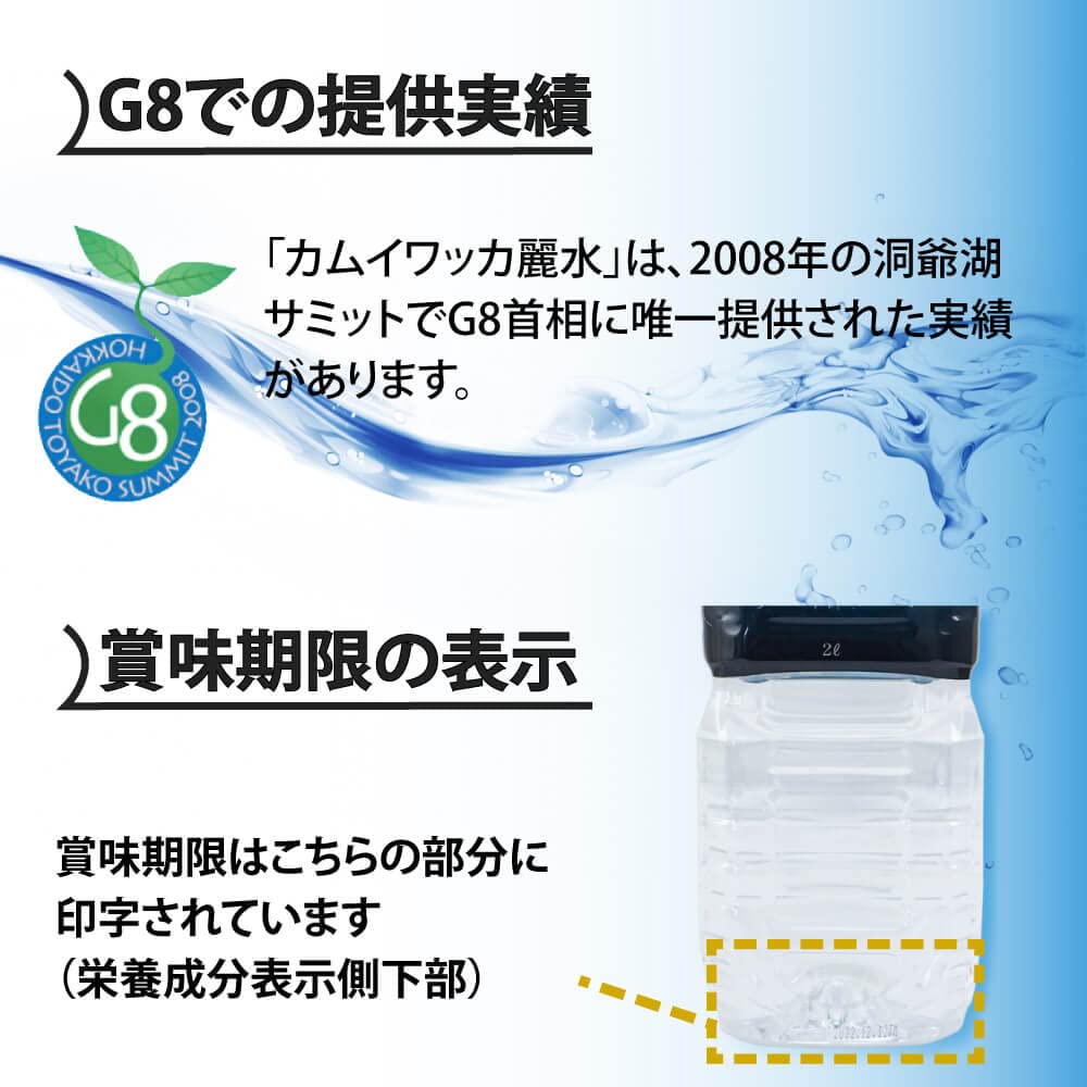 【10年保存水】ミネラルウォーター「カムイワッカ麗水 2L×6本セット」。 商品の説明 10年保存水 カムイワッカ麗水 使用方法 飲料水、災害時の消毒、料理など幅広くお使いいただけます。 賞味期限:製造日より10年(商品に記載)。 S000-K9999