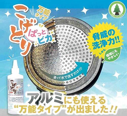 こげとりぱっとビカ 万能タイプ(300g)アルミ対応品。 頑固なコゲ付きも塗るだけで簡単に落とすことができる【こげとりぱっとビカ】に、アルミ製品に使える製品が登場! 従来のこげとりぱっとビカは鉄、ステンレス等の焦げ除去に圧倒的な効果を持っていましたが、その強さゆえにアルミ製品等には使用できないとしておりました。 こちらの【こげとりぱっとビカ万能タイプ】は、鉄やステンレスだけでなくアルミ製の鍋やヤカン、フライパン等にも使用できるよう改良したものです。 主にアルミ製品やガラス製品等の焦げ落としに適しています。 ※鉄やステンレス等の焦げ落としには従来の緑ラベルの【こげとりぱっとビカ】をお勧めしています。 使用上の注意 焦げ コゲ こげ 焦げ付き 焦がし 続きを見る 焦げ落し コゲ落し こげ落し 焦げ取り コゲ取り こげとり 焦げ付き落とし 焦げ取り洗剤。 S350-K9999