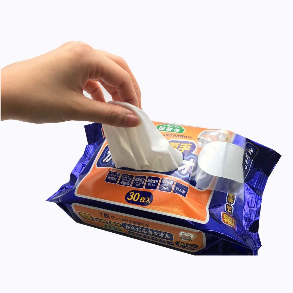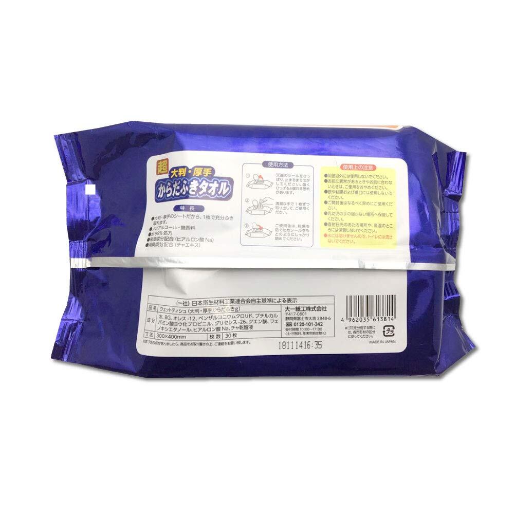大一紙工 からだふきタオル 超大判・超厚手 30枚入×3個セット(計90枚)弱酸性 使い捨て ボディタオル 使い捨てタオル 介護 からだふきシート。 超大判・厚手からだふきタオル 30枚入×3個セット(計90枚)のお徳用。 寸法:300×400mm。 水99%処方 ノンアルコール・無香料。 保湿成分配合(ヒアルロン酸Na)。 消臭成分配合(チャエキス) 日本製。 S000-K9999